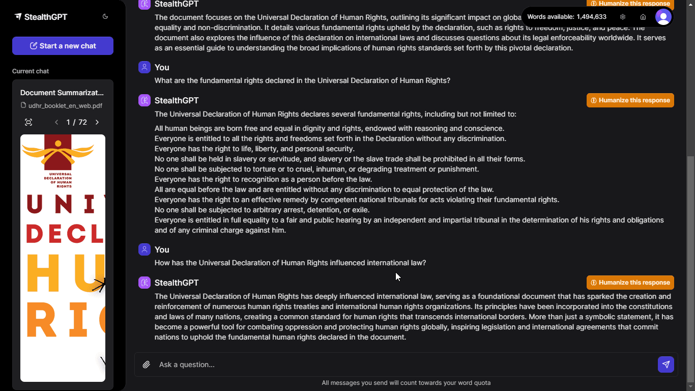 Besides content generation, StealthGPT's time efficiency helps with reading. Do you ever feel like you're not up for reading a lengthy academic paper and would rather just have the key points under your belt? Using Chat with Stealth, send StealthGPT the document and ask it to summarize the paper for you. It'll do that almost instantly.