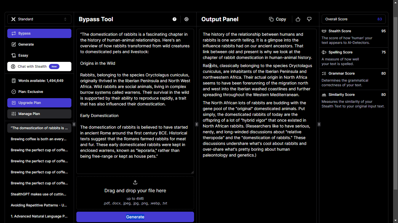 You may need to fact-check the Stealth text to ensure that no fake facts are included in it, but you can be confident that the text is coherent and original. With StealthGPT by your side, you'll never have to face plagiarism claims again.