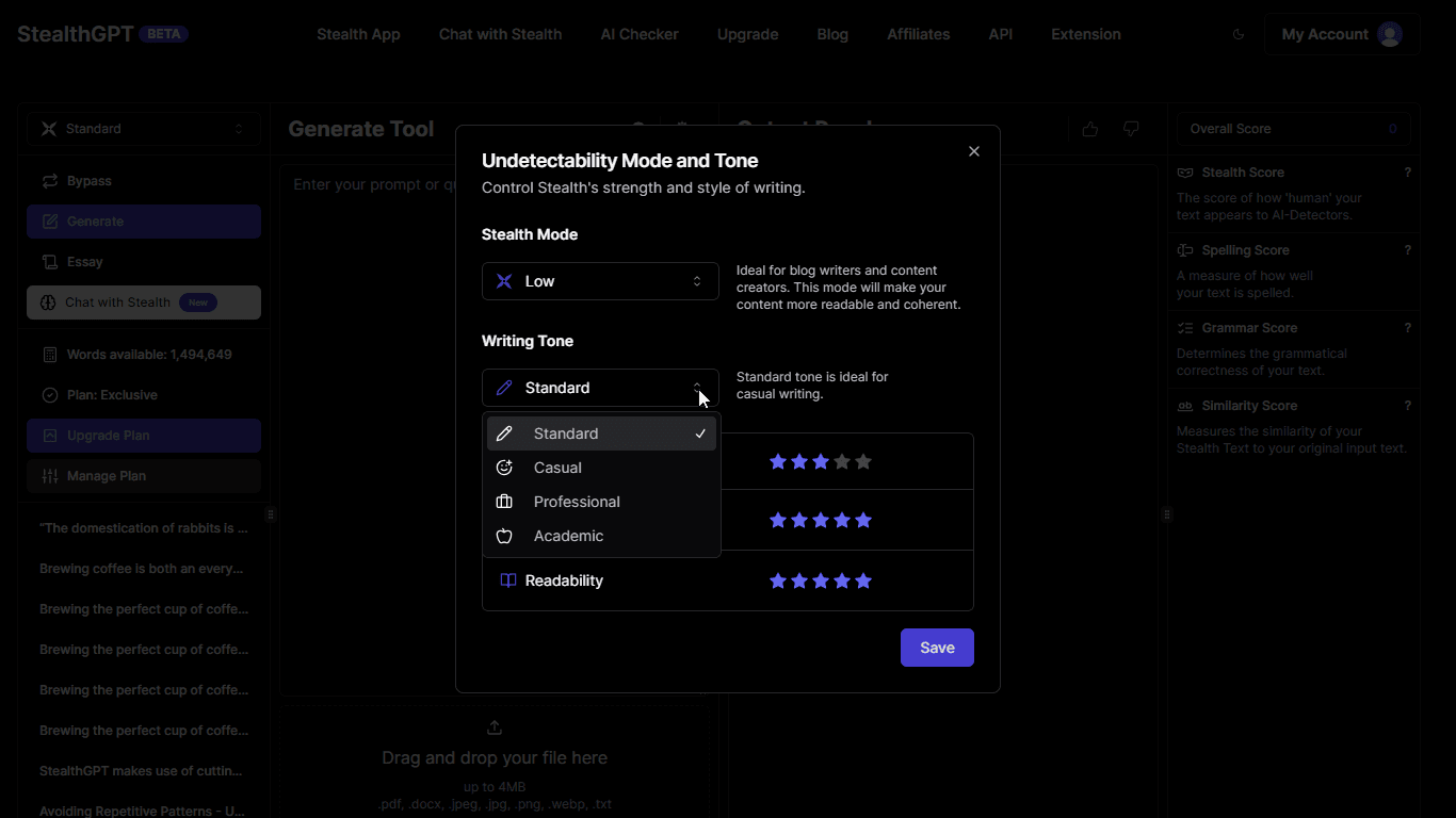 Please note that the tones available on StealthGPT aren't there for show. Each one influences the undetectability of the paraphrased content, so choose wisely.