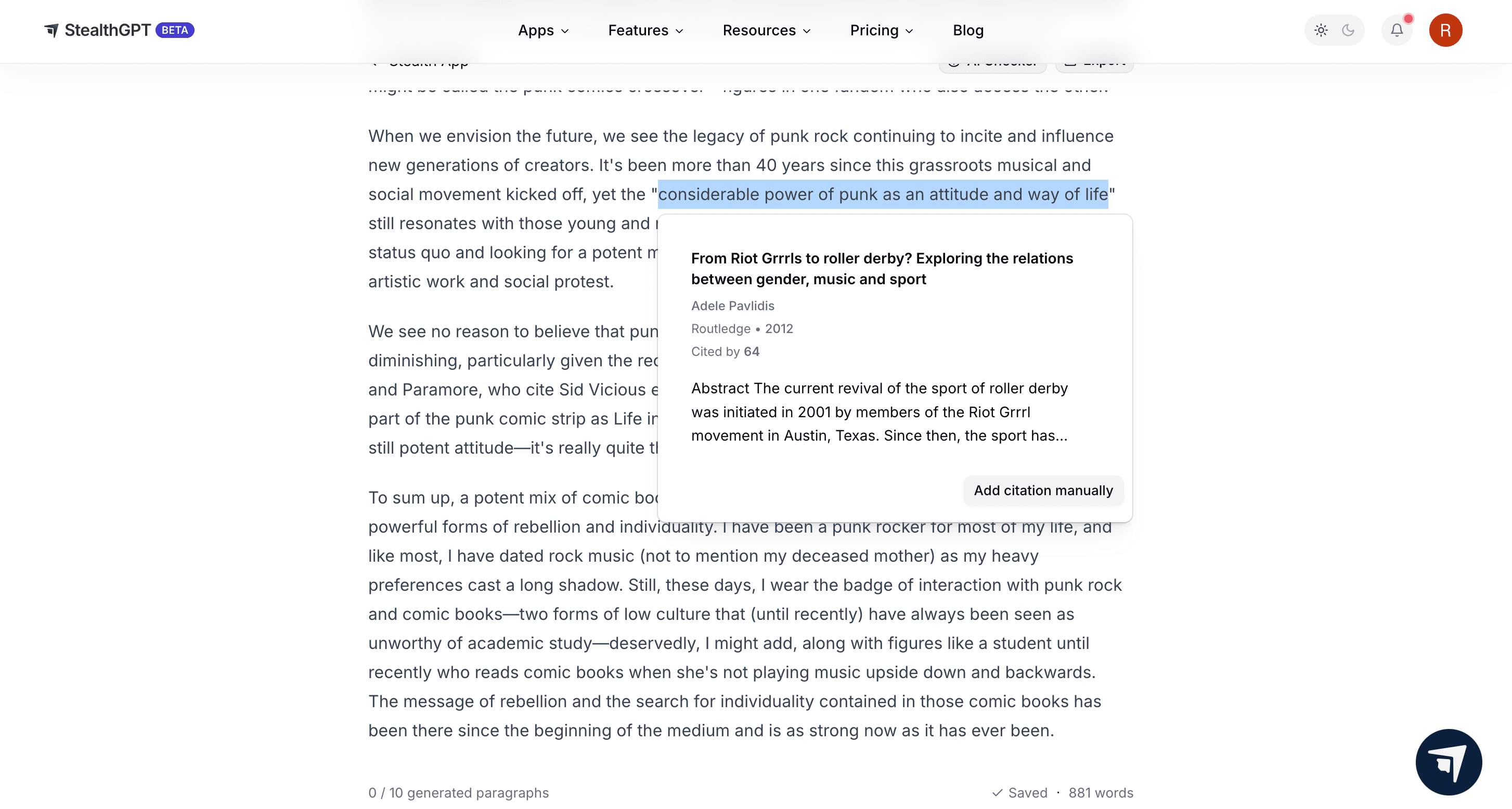 Using Stealth Writer’s new In-text citations feature, you can input as many quotes as you need and it will automatically write them out in whatever format you require. Here’s how we put it to use in our essay:
