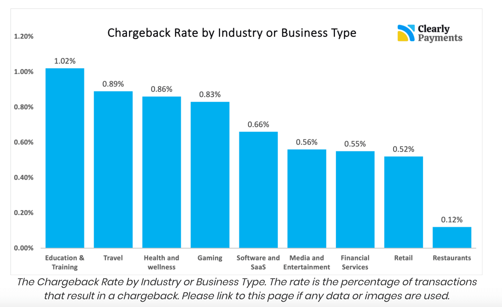 As the Clearly Payments graph below demonstrates, the current rate of chargebacks varies by industry, with 1.02% in education and .52% for eCommerce businesses.