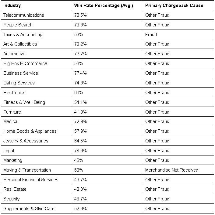 Below is a Kount graph of chargeback win rates varying by industry: