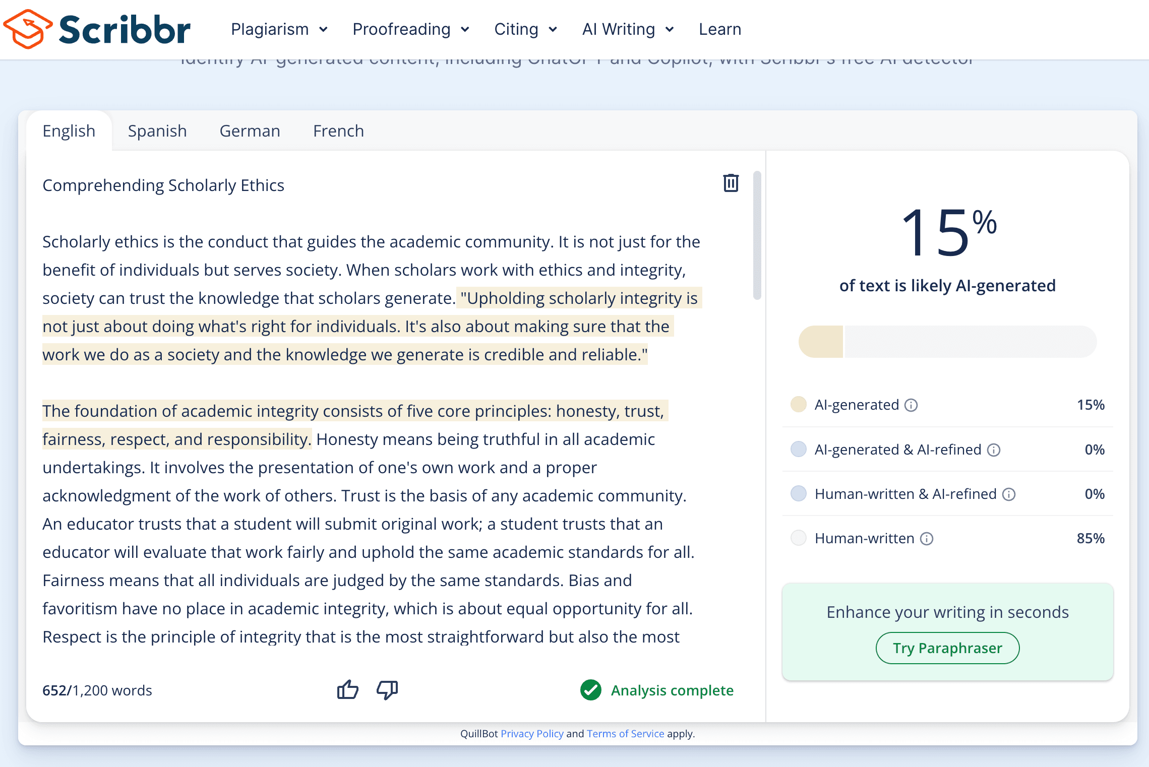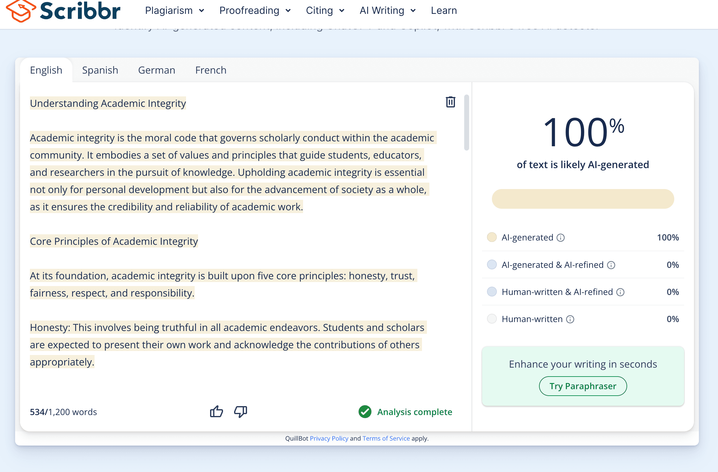 And here's what happens when we put Stealth Writer's essay through Scribbr: