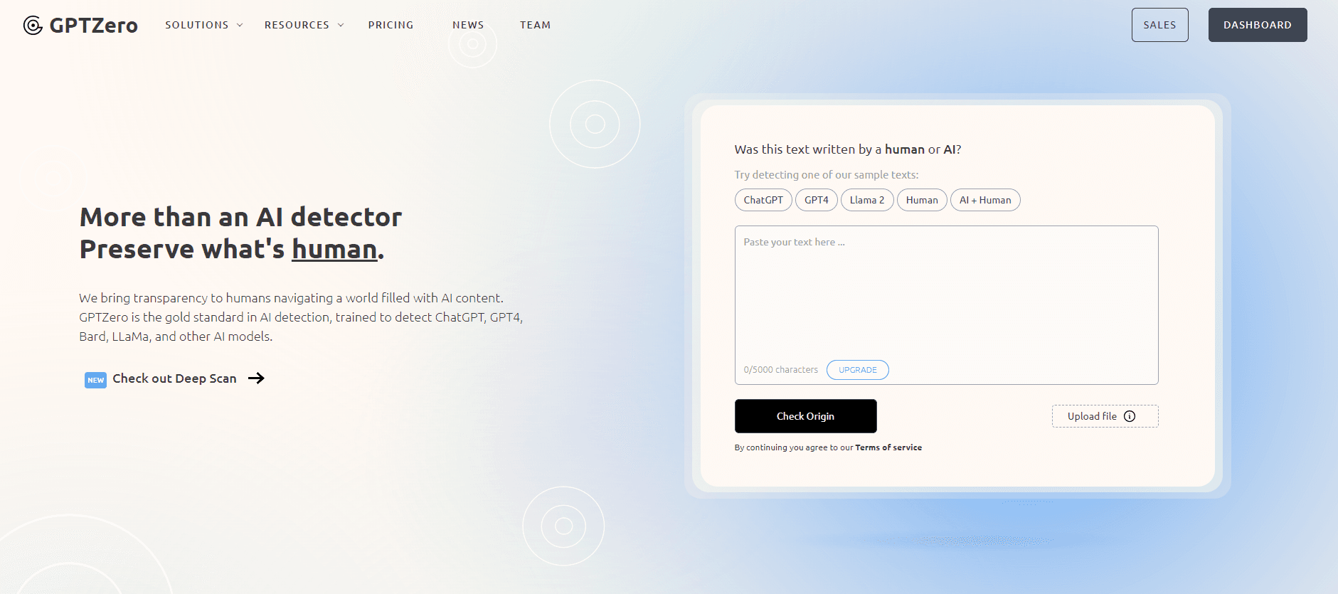 Ability to detect content generated by AI, including text produced by advanced models like GPT-4 and ChatGPT.