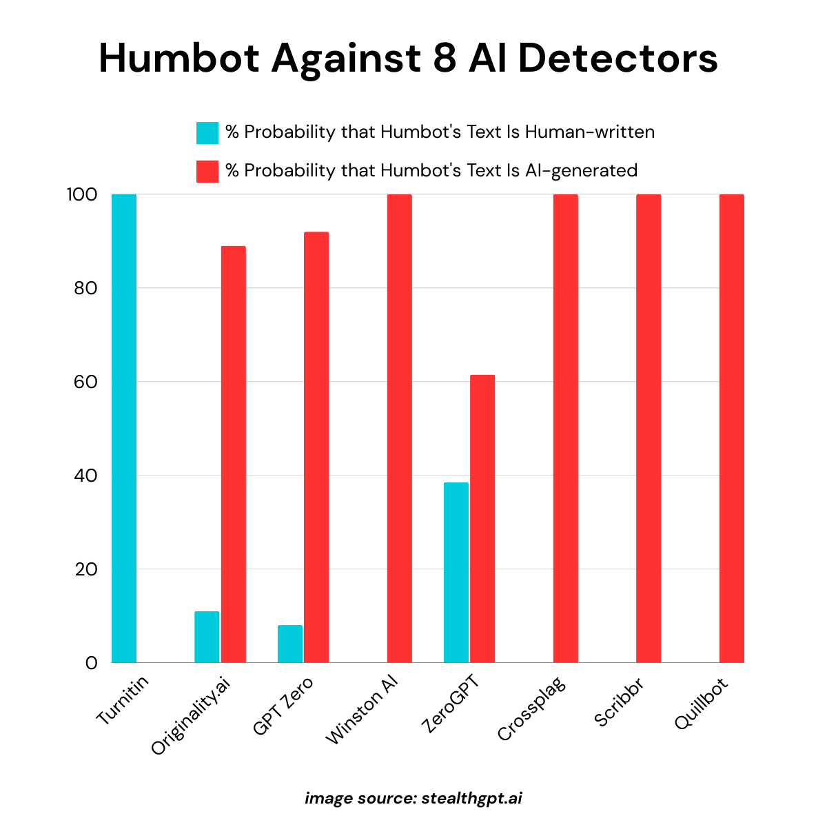 Humbot's content was completely undetected by Turnitin. However, every other AI detector flagged the text, giving it the following human scores: