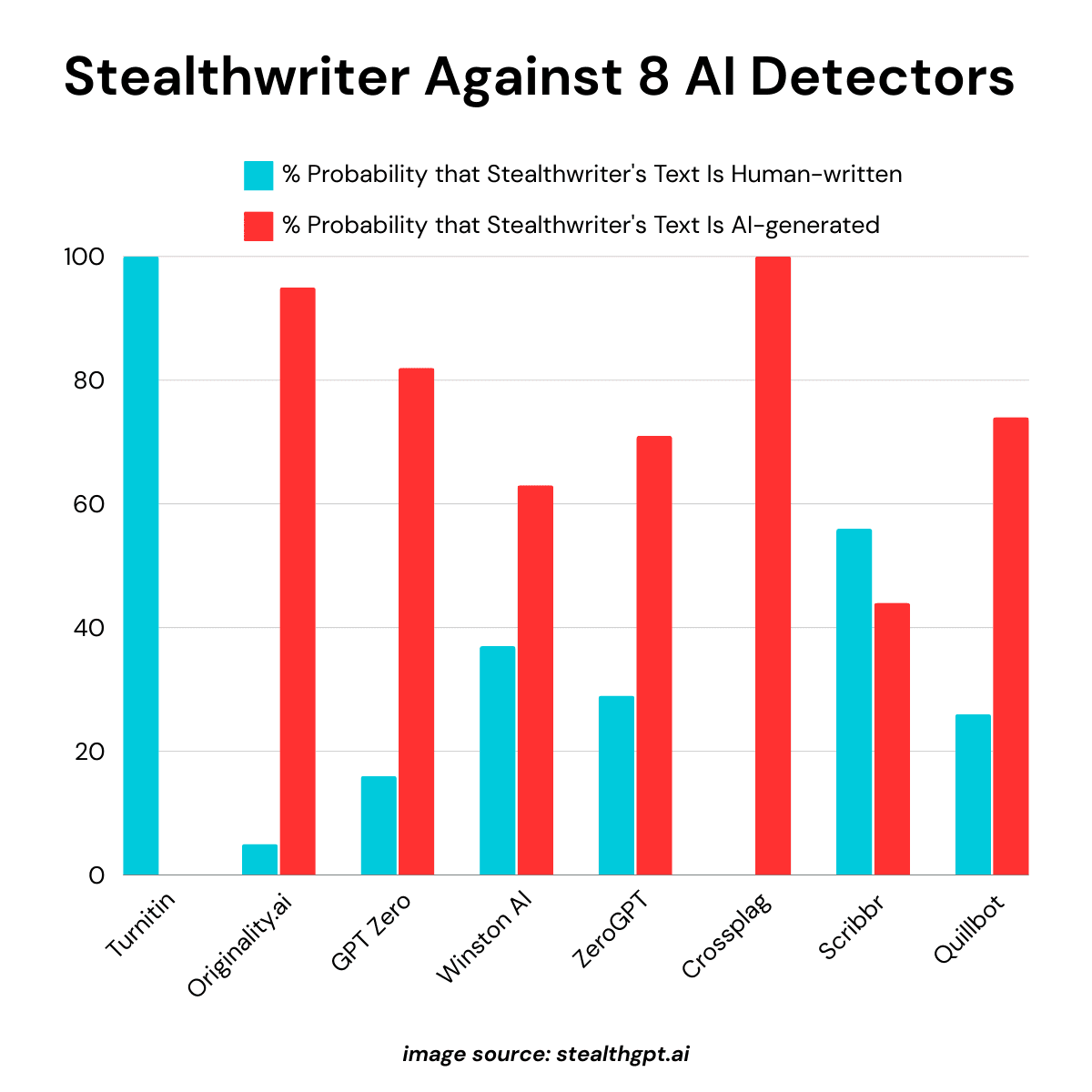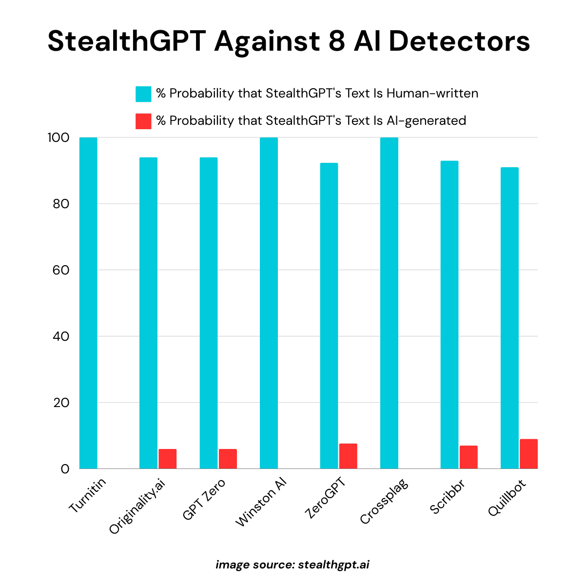 According to the chart, Turnitin, Winston AI, and Crossplag predicted that there was a 100% chance that StealthGPT's content was human-written. Originality.ai and GPT Zero flagged only 6% of the text.