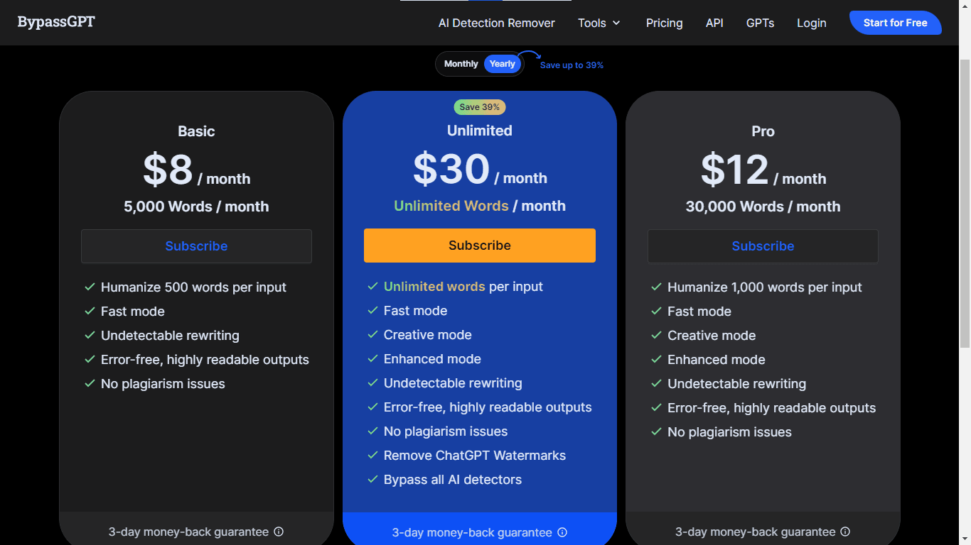 The image above shows StealthGPT's pricing plans. StealthGPT's offer and value far surpass every other competitor on the list.