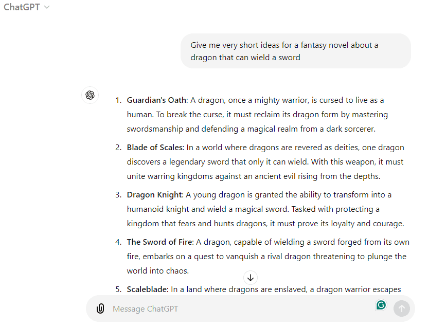 I’m a writer myself, of books and whatnot. Here’s what happens when I ask ChatGPT for ideas for fantasy books: