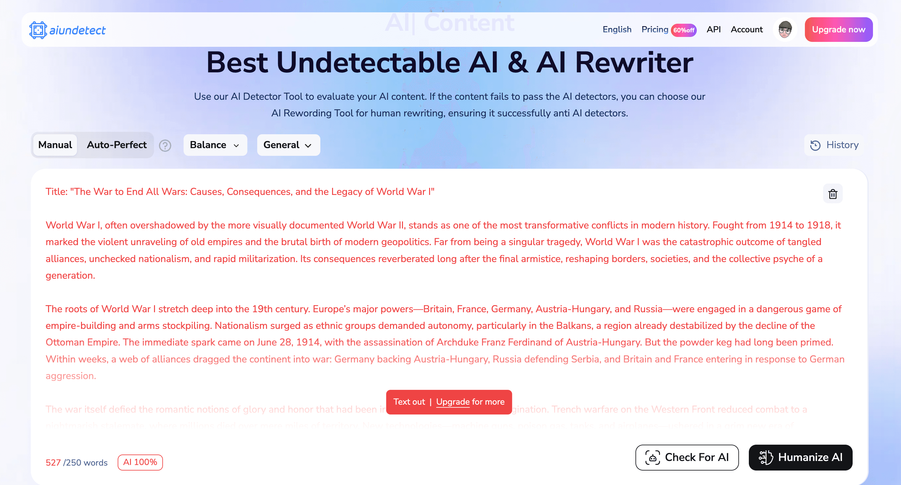 With a clean interface and simple controls letting you either use their detector or humanizer, this seems like an easy, free AI writer that might actually work for someone that just types in the right search query and finds it on Google.
