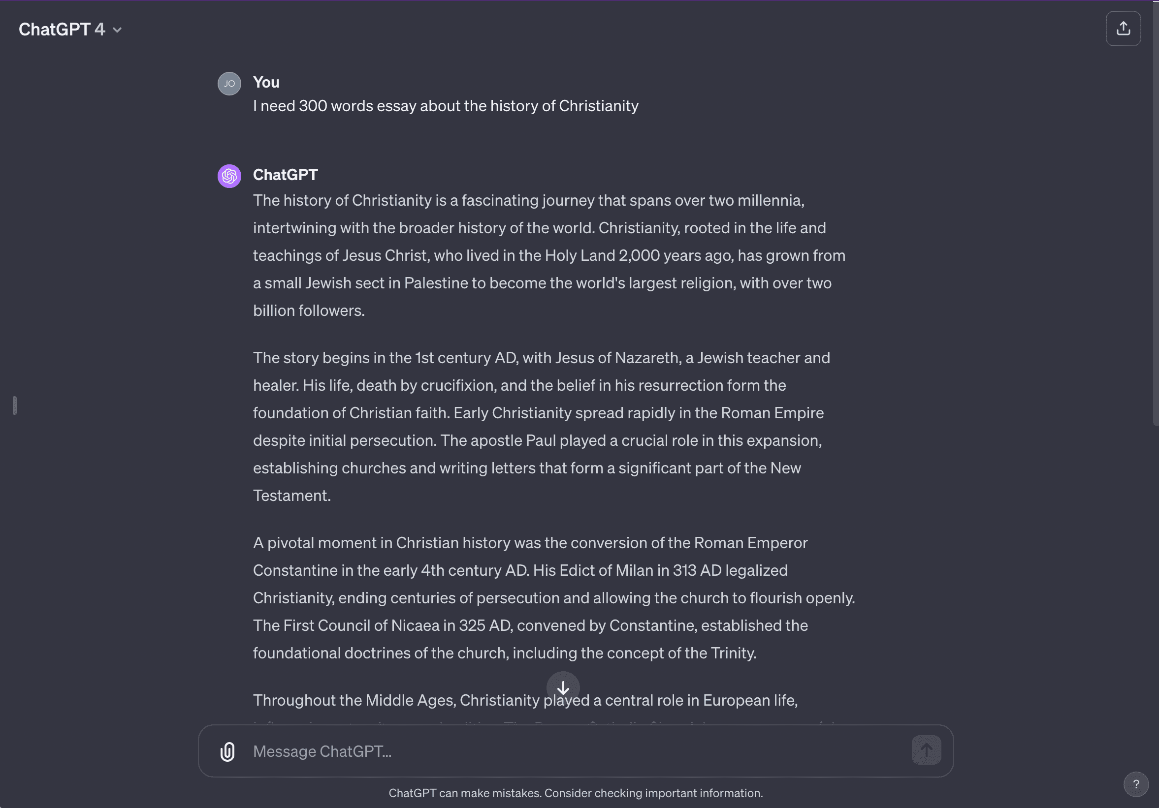 First, we asked ChatGPT to create a 300-word essay about the history of Christianity. Here's a screenshot of the essay.