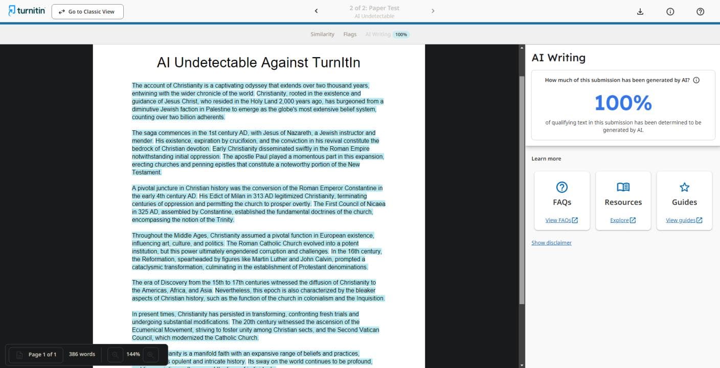 TurnItIn detected that 100% of the words in the essay humanized with AI Undetectable had been AI-generated. Sadly, despite its huge claims, AI Undetectable couldn't bypass TurnItIn.