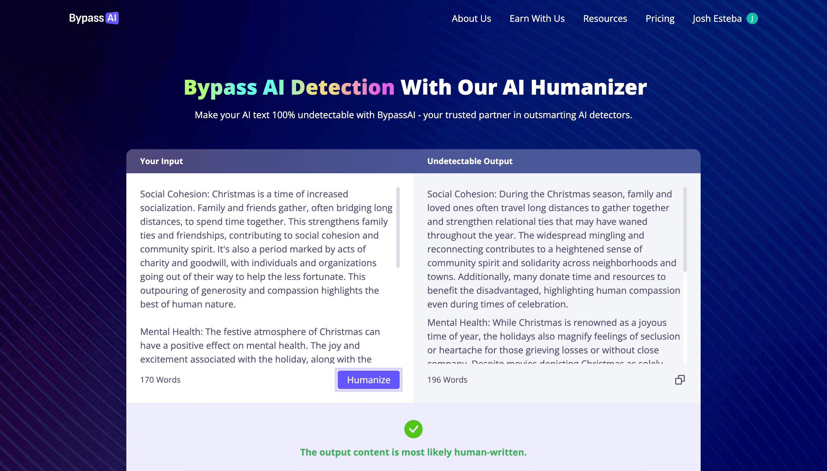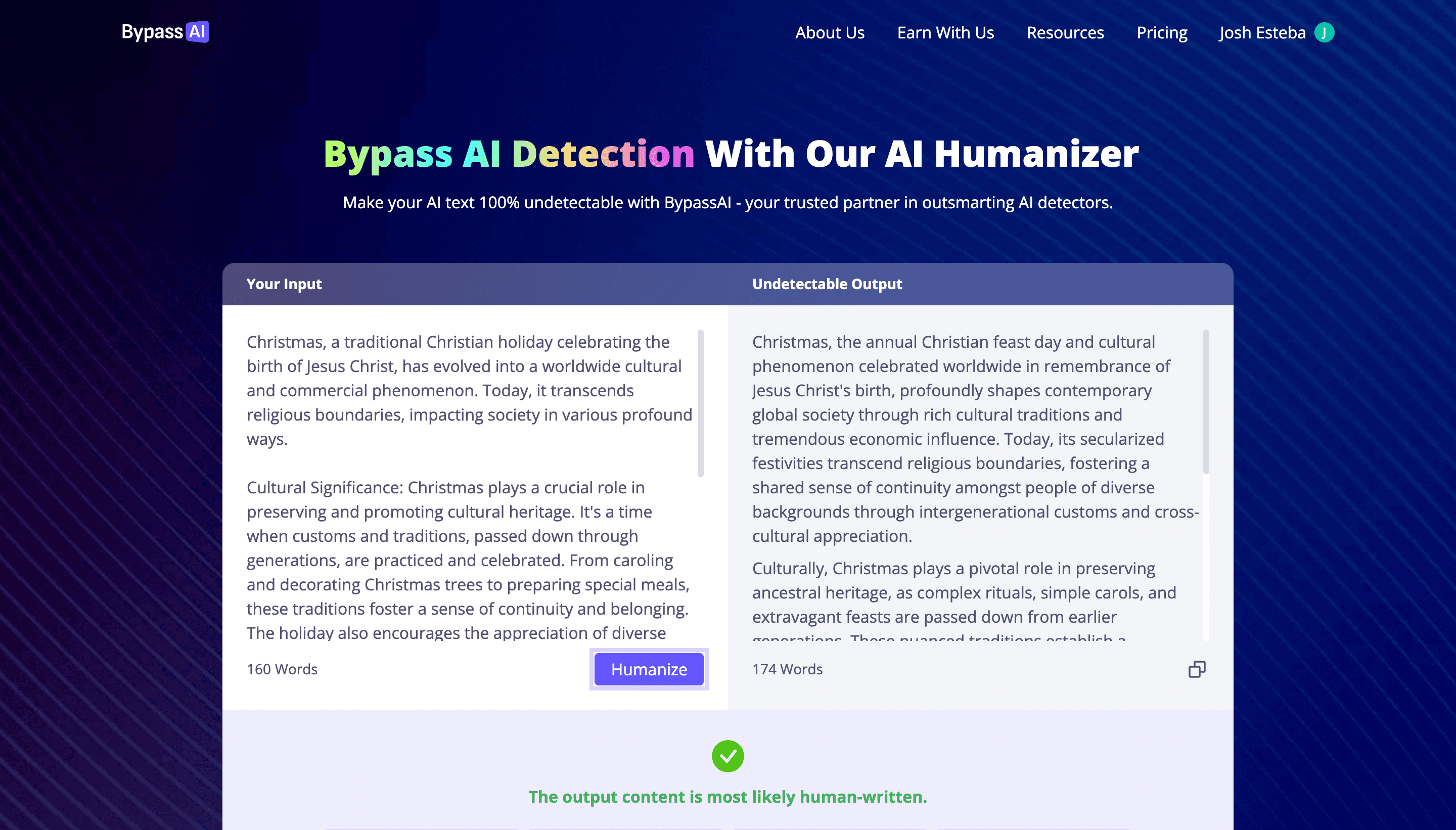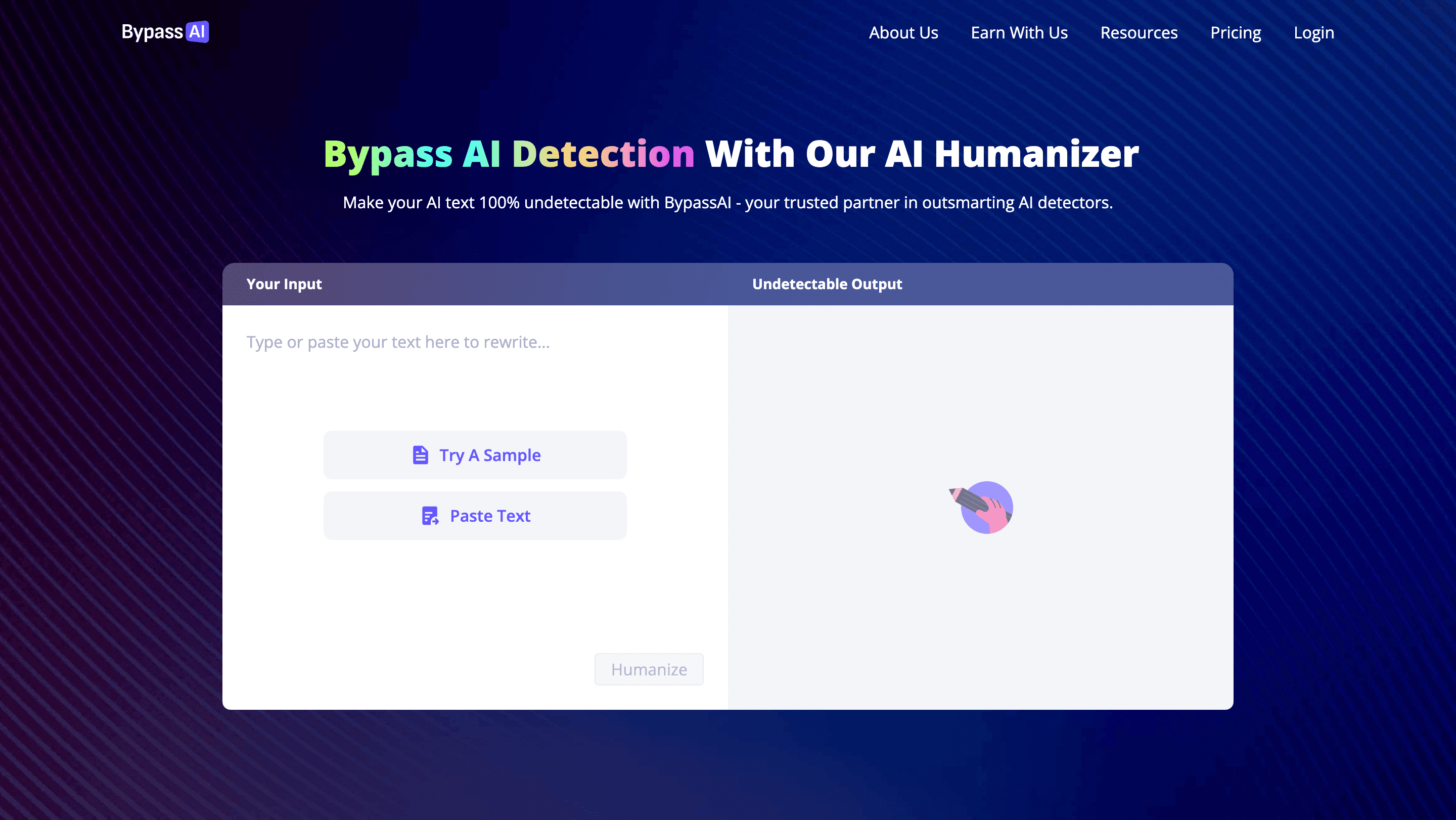 Bypass AI claims to be a powerful AI humanizer that transforms your AI-generated content into naturally authentic, undetectable text, allowing you to bypass all AI detectors. They claim to make your AI text 100% undetectable and trustworthy partner for outsmarting AI detectors. Let's put it to the test.