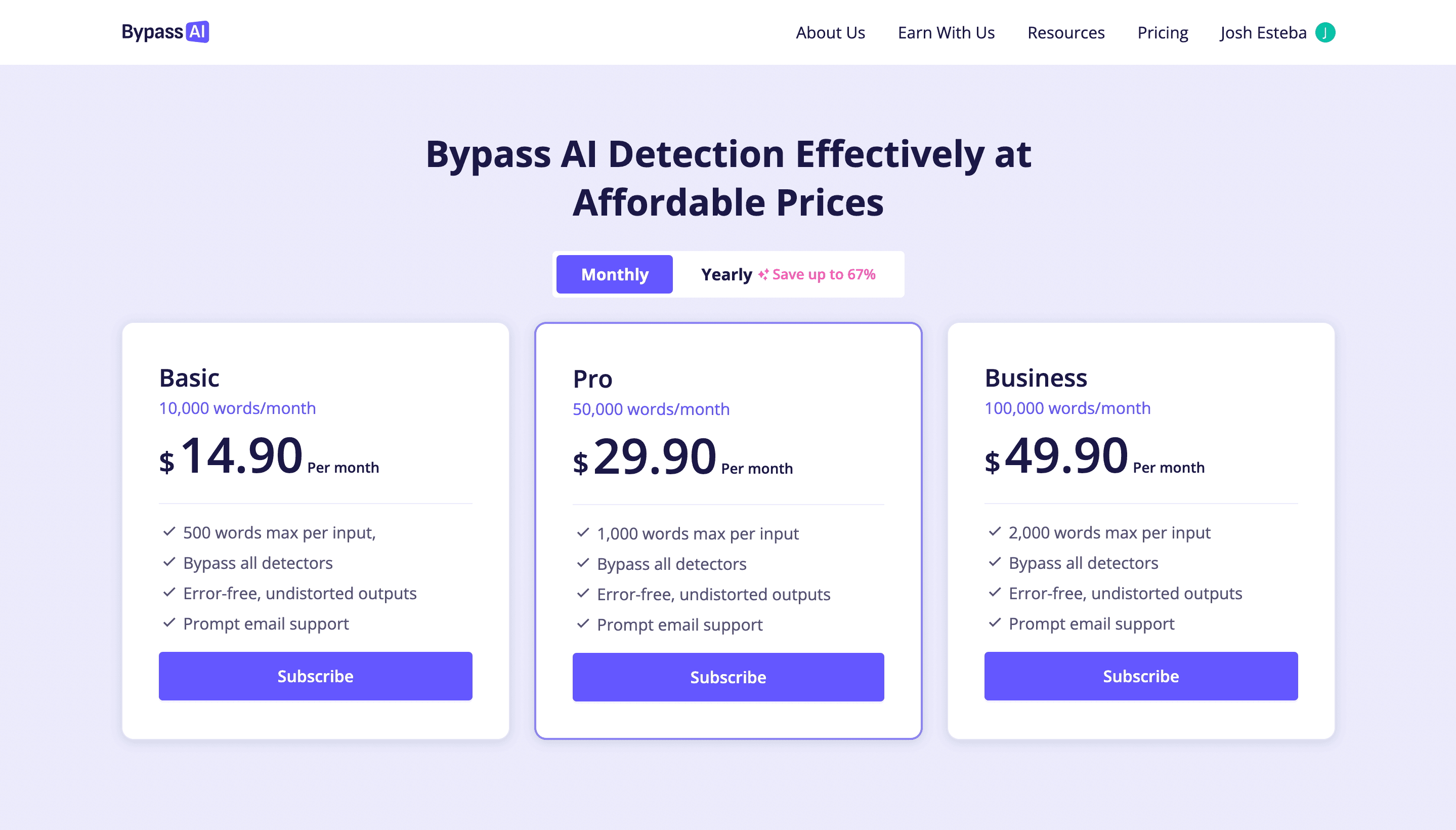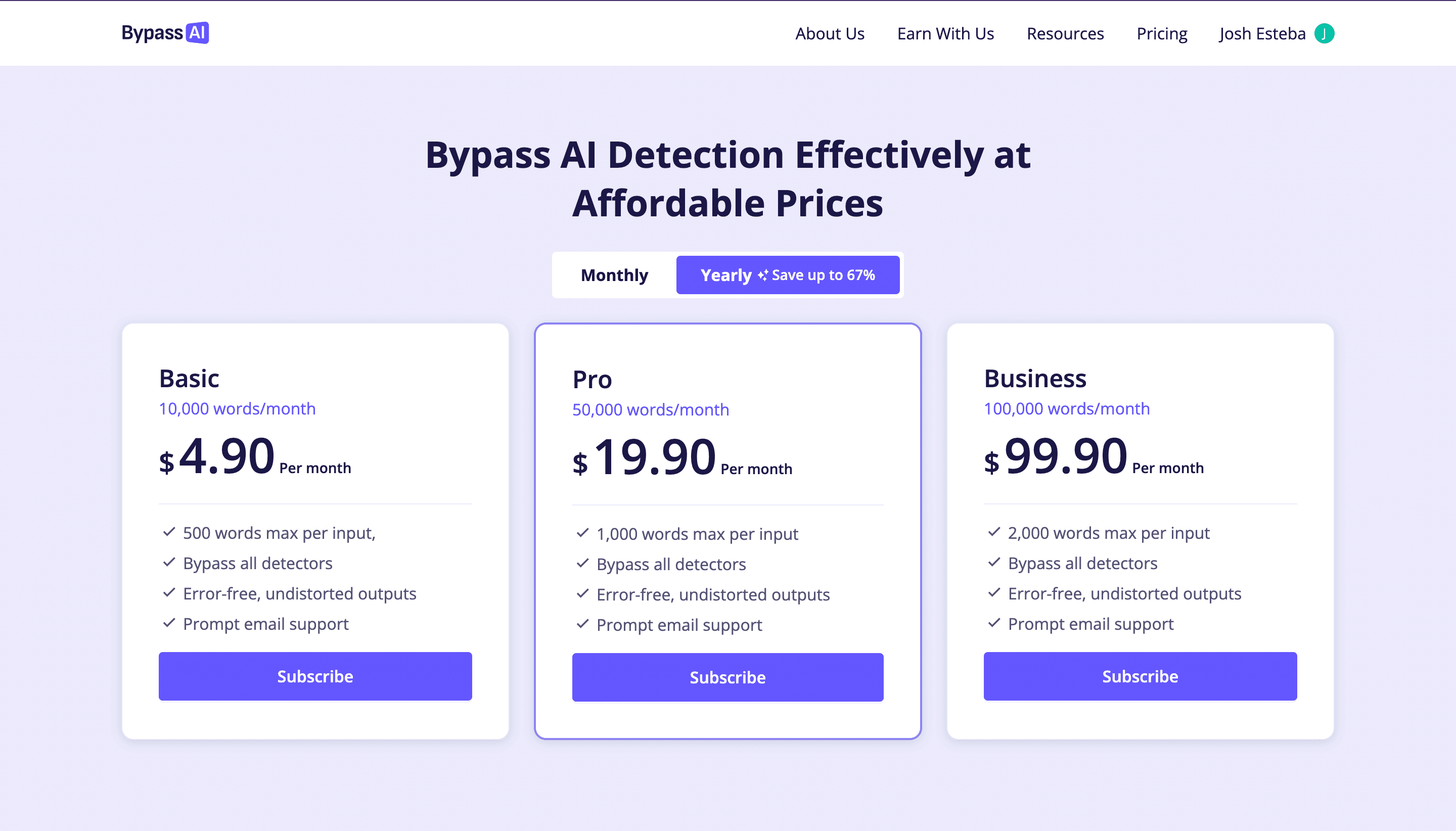 While Bypass AI offers cheaper pricing than StealthGPT at $14.90 per month for 10,000 words, you are more likely at risk of getting caught by AI detectors such as GPTZero, Originality, and TurnItIn. The value you would get from Bypass AI isn't any better and you are basically asking to get caught by your highschool/college institutions. Bypass AI and StealthGPT's price are similar but StealthGPT offers so much more value compared to Bypass AI. Just an extra 9 cents more and you'd get 100,000 words per month option while also getting the assurance that you won't be detected by GPTZero, Originality, and TurnItIn. It's clear who the true winner is in this case when we are comparing pricing and value.