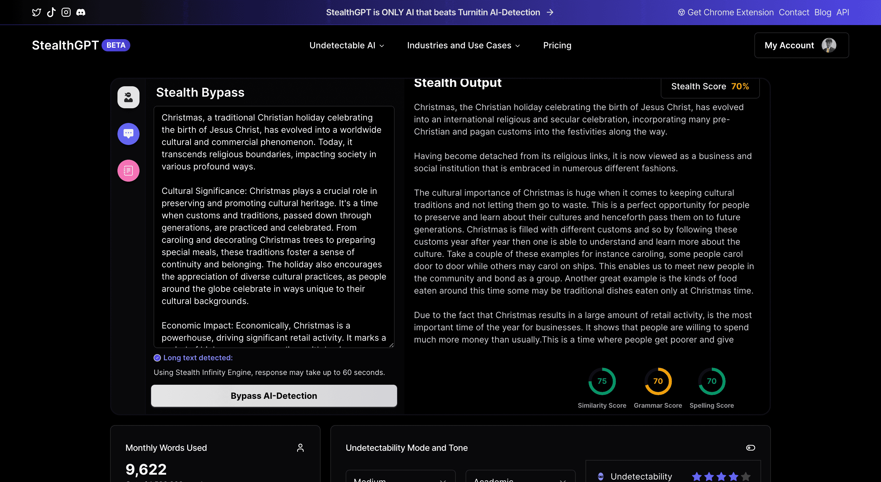 StealthGPT is the best Undetectable AI website out there, beating major AI detectors such as GPTZero, Originality, and TurnItIn. If you are a highschool or college student looking for the best AI humanizer tool in the market then look no further. It's simple, easy to use, and there's plenty of evidence you need to give you the assurance of staying undetected. Try StealthGPT out today!