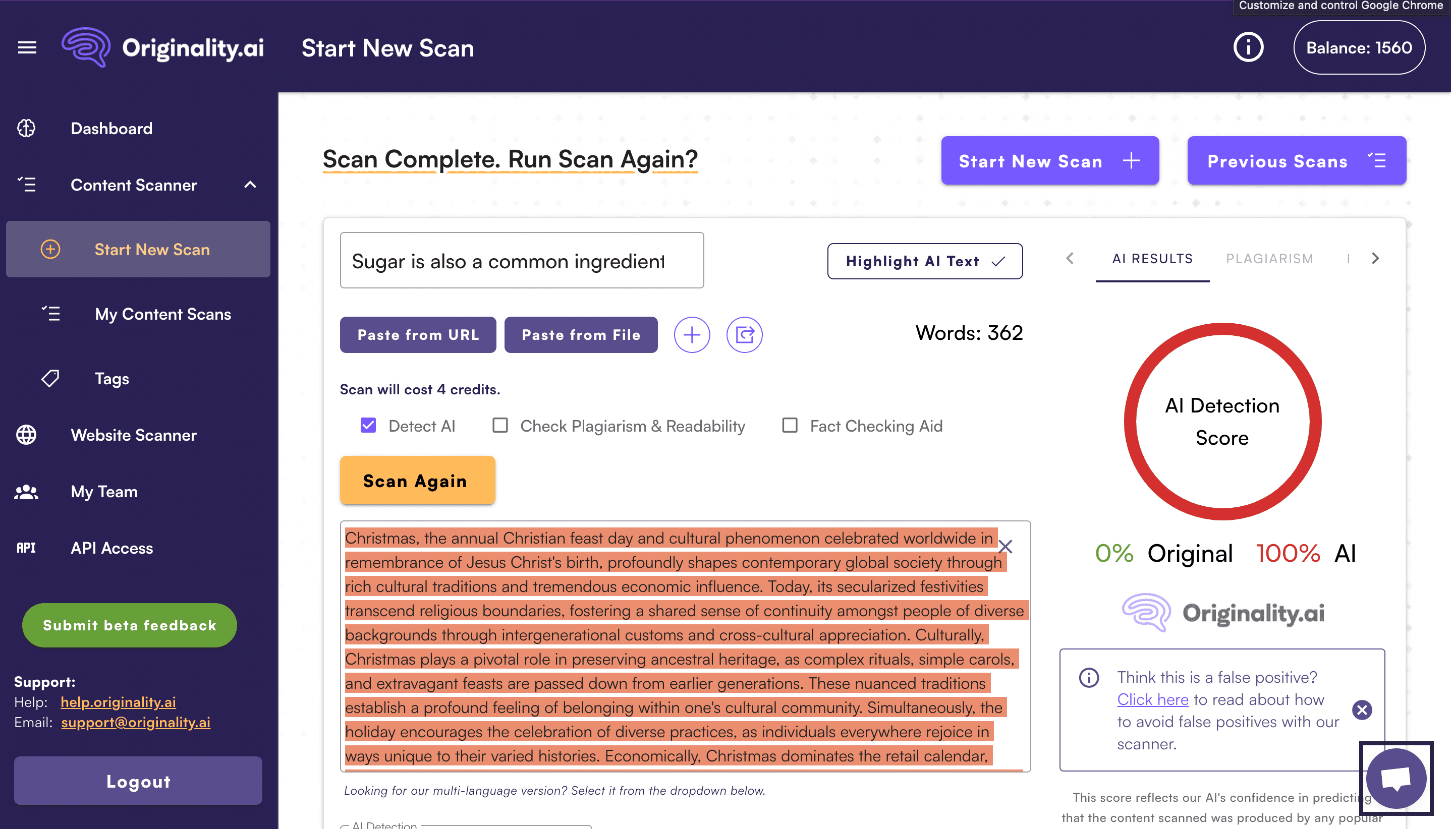 At this point are we even surprised? 100% AI detection score from Originality is a clear sign that Bypass AI cannot bypass major AI detectors. Let's see how Bypass AI goes up against TurnItIn.