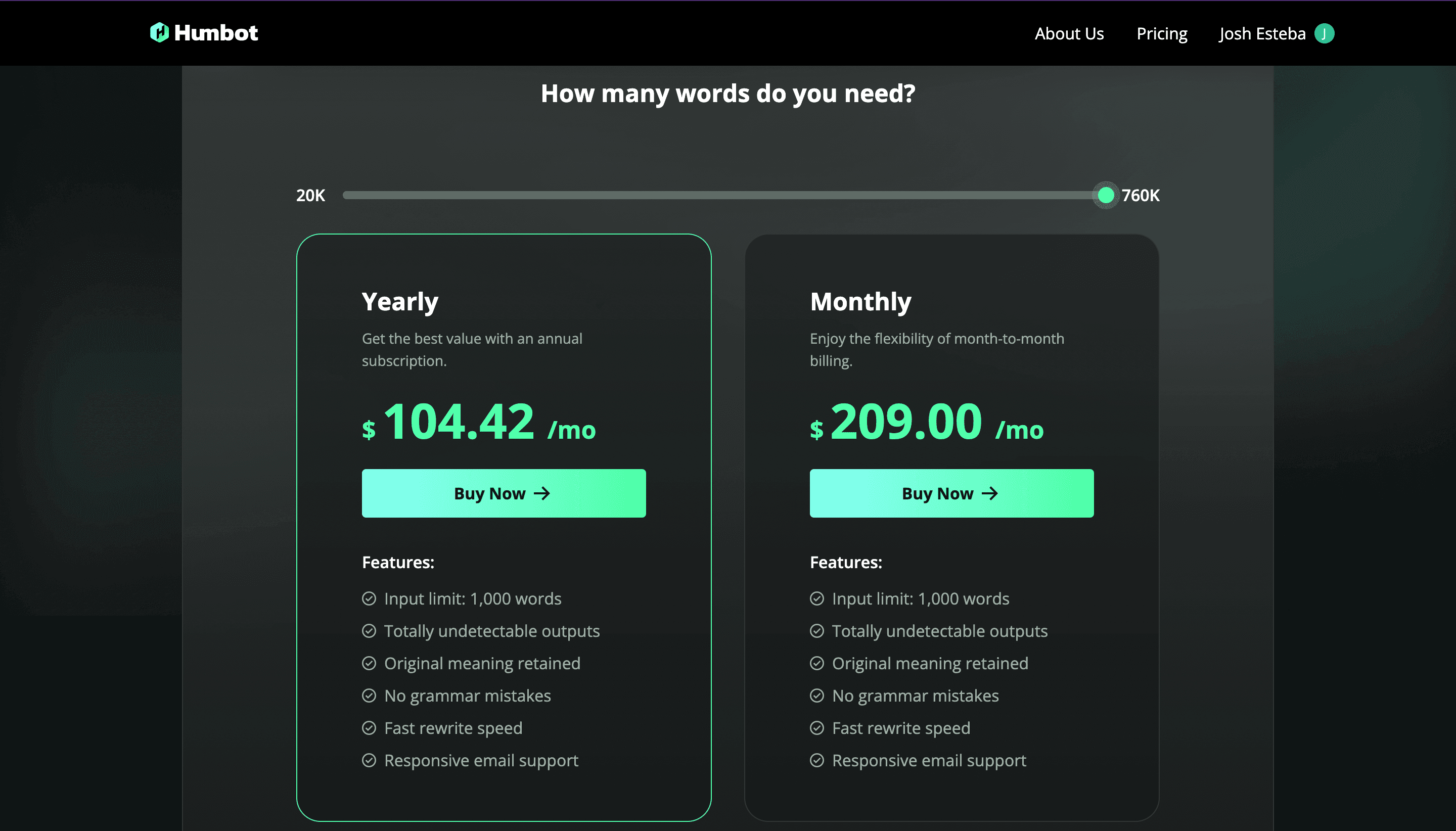 Starts at $9.99 per month for 20,000 undetectable AI words, 1 user, "totally undetectable outputs," no grammar mistakes, and fast rewrite speed. Annual price starting at $60 for 20,000 undetectable AI words. There is a slide feature that lets the user adjust according to their needs. Max of $209 per month for 760,000 undetectable AI words and yearly plan of $1,253.04 for 760,000 undetectable AI words.