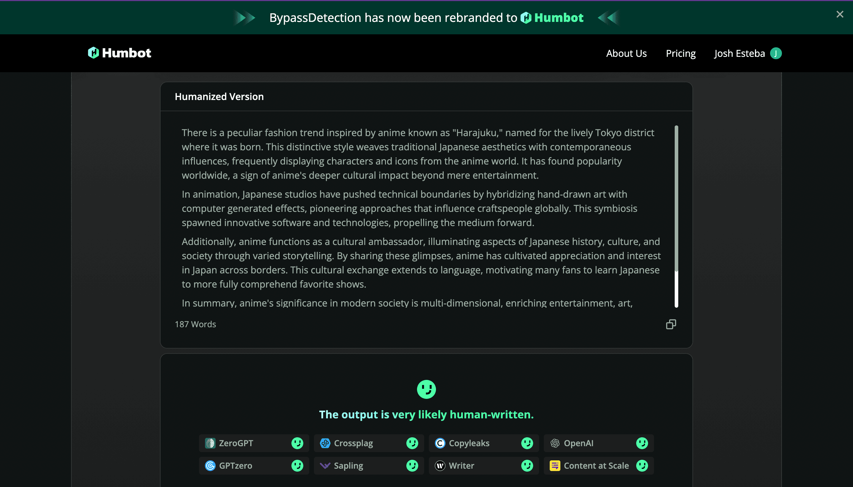 Humbot claims to be the ultimate solution to bypass AI detection. Humbot can easily humanize AI text into authentic and original content undetectable by most detectors. Humbot claims to be a trustworthy AI humanizer to bypass AI detection capable of being undetectable by most detectors such as: GPTZero, Content at Scale, Winston AI, Copyleaks, TurnItIn, ZeroGPT, and OpenAI's Text Classifier. Let's put it to the test to see whether or not their claims are true.
