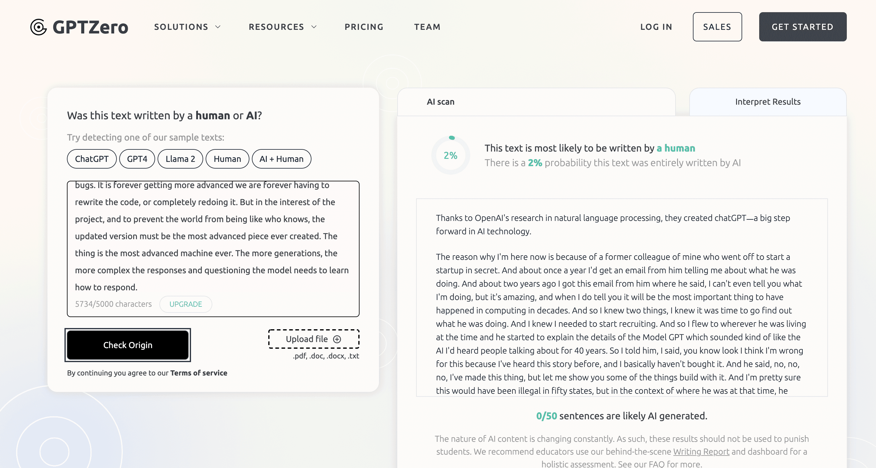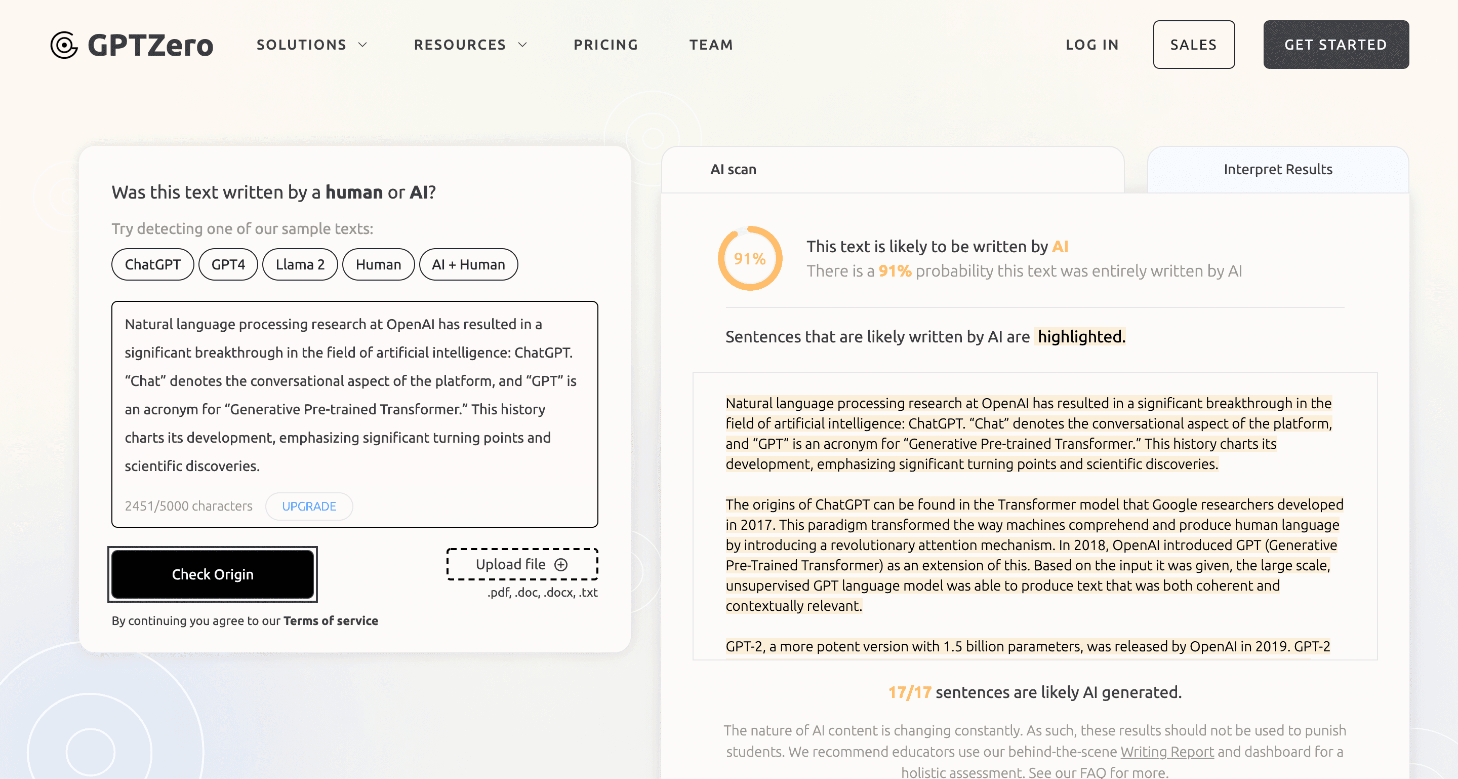 AI Detection Across Models: GPTZero adeptly identifies content generated by various AI models, including ChatGPT, GPT-4, GPT-3, GPT-2, LLaMA, and other AI services rooted in these models.