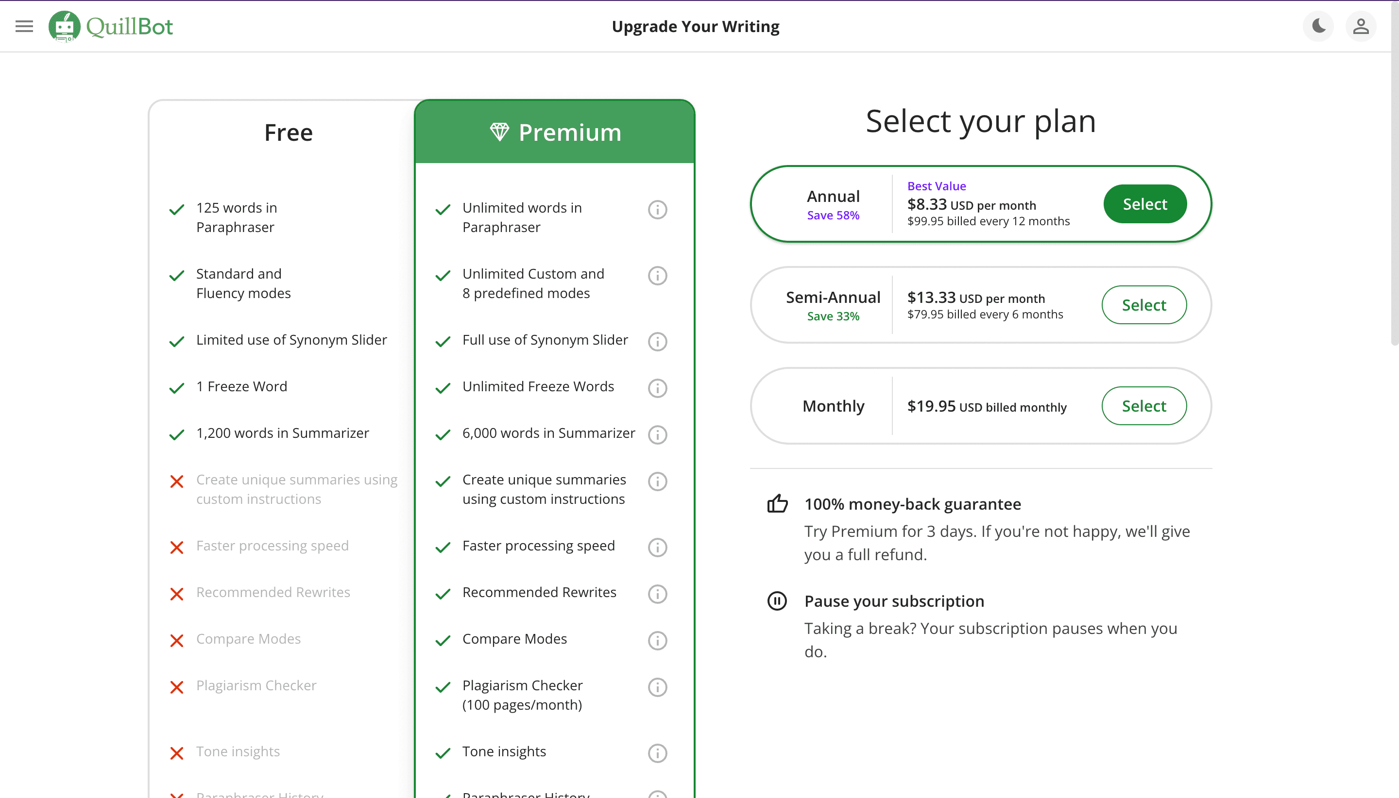 Plagiarism Checker: Quillbot includes a feature to check for plagiarism, which is vital for academic integrity and content originality. This tool compares text against a vast database to ensure uniqueness.
