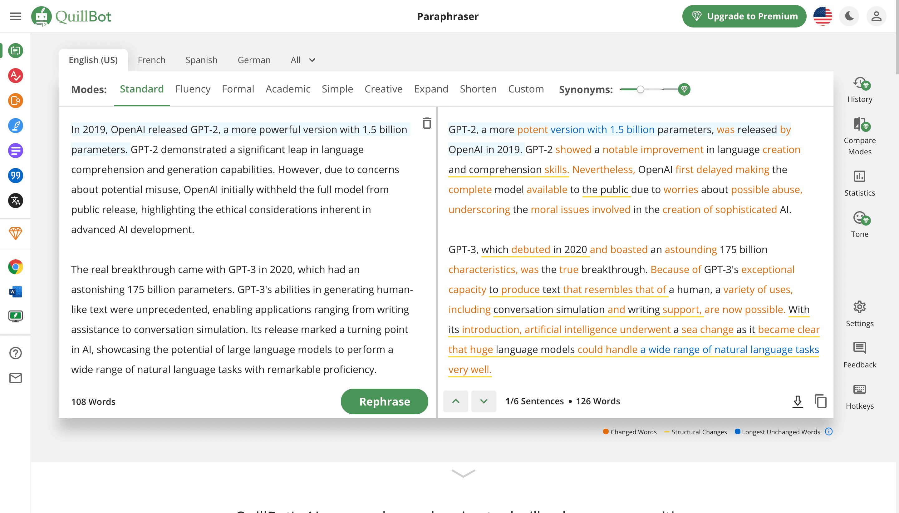 Paraphrasing Tool: Quillbot's core feature is its ability to restructure text, substitute words, and provide a refreshed version of the original content. This feature is particularly useful for avoiding plagiarism and enhancing clarity.