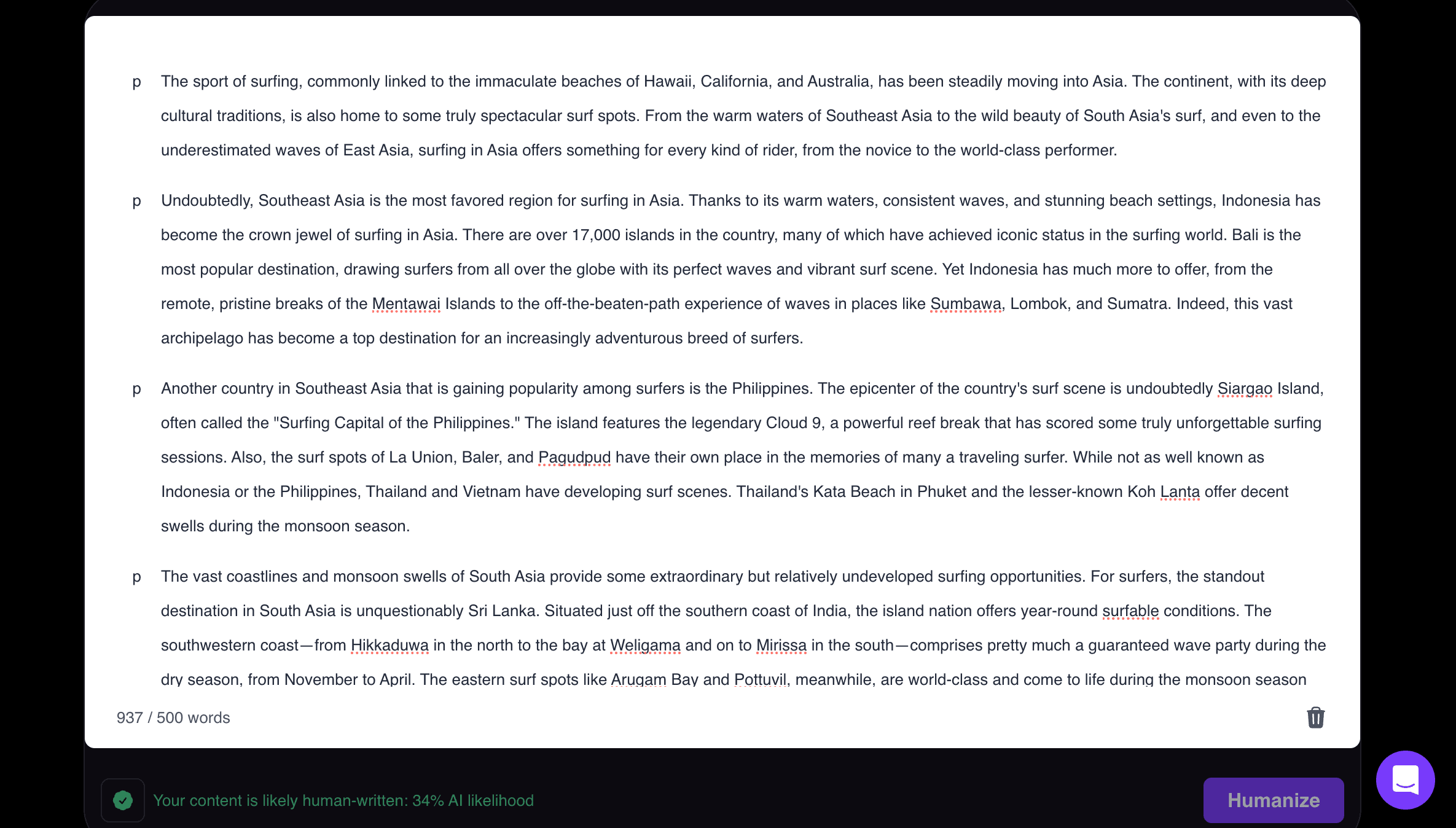 So, lets create some AI generated content with ChatGPT. We’ll make an article about surfing. Here’s a snapshot of it: