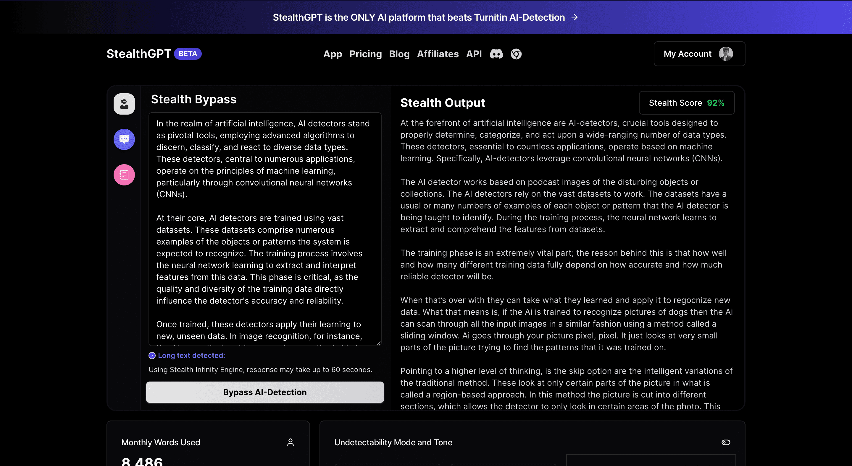 StealthGPT is an advanced artificial intelligence tool designed to generate written content that is undetectable by AI detection systems. It uses sophisticated algorithms and natural language processing techniques to produce text that closely mimics human writing styles. The primary aim of StealthGPT is to create content that bypasses the detection mechanisms of systems like Turnitin, which are designed to identify AI-generated text. This makes StealthGPT particularly useful in scenarios where the authenticity of human-like writing is crucial, such as in academic writing, creative content creation, and other professional fields where originality and the human touch in writing are valued. The tool is part of a growing trend of AI applications that blend seamlessly into human-centric environments, offering solutions that are both innovative and indistinguishable from human-created work.