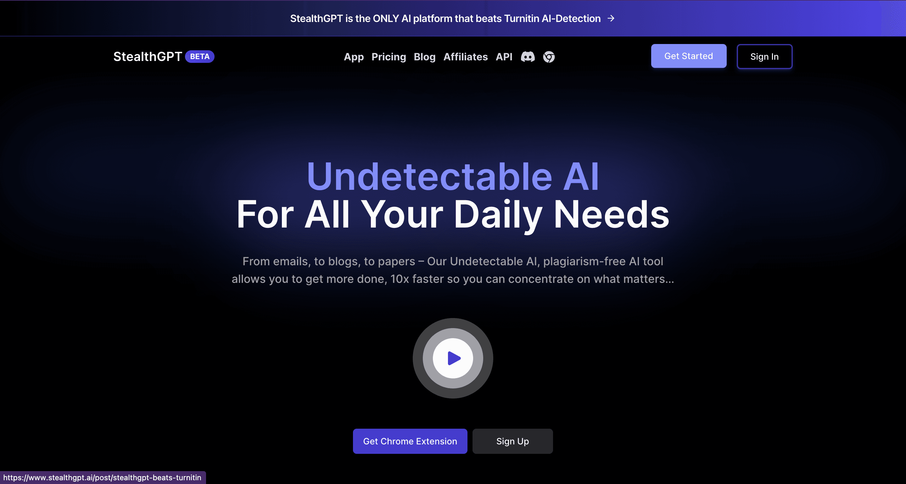 StealthGPT is currently the best Undetectable AI website out there, beating even TurnItIn. Check it out in here. If you are a highschool or college student looking for the best AI humanizer tool in the market then look no further. StealthGPT consistently beats GPTZero, Originality, and TurnItIn. It's simple, easy to use, and give you the assurance you need to make sure you stay undetected.