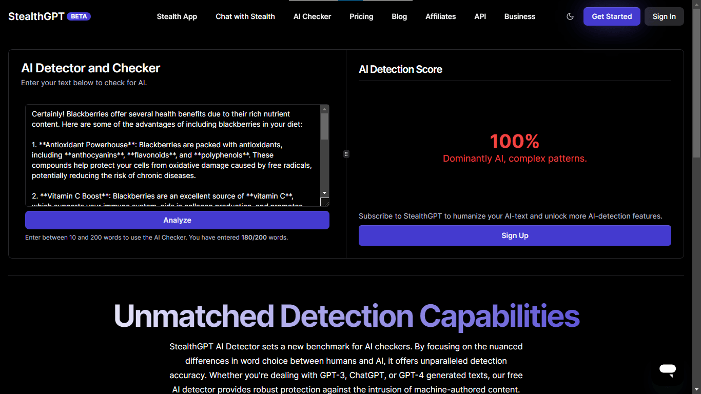 We generated this text using Copilot. If you read it, you'll notice that the phrase “blackberries are” appears more than once. This phrase is a bigram because it contains two tokens, “blackberries” and “are.” We'll now input this text into StealthGPT’s AI checker. Here's a screenshot of what StealthGPT thinks about the text: