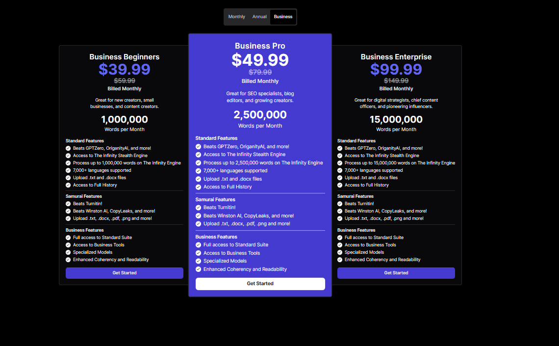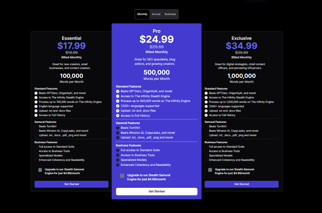 StealthGPT offers various pricing plans to cater to different needs for both personal and business uses. The “Essential Package” is great for new creators, small businesses, and content creators who want to start at 100,000 words to explore StealthGPT features.