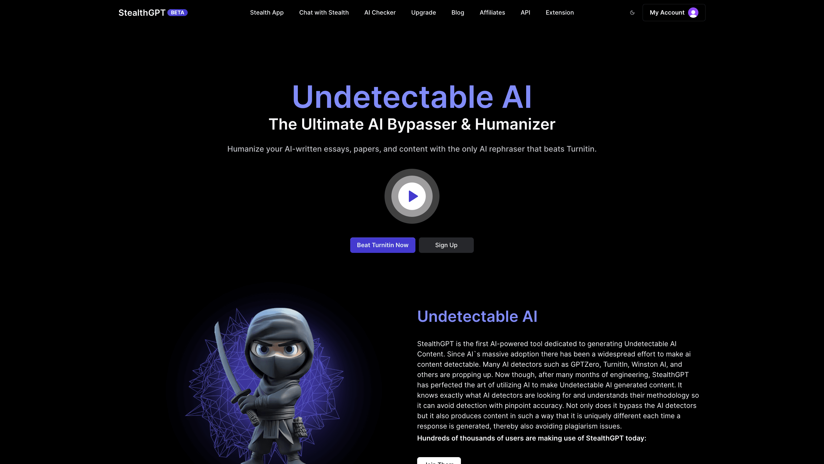 StealthGPT is the number one undetectable AI proven to beat AI Detectors employed by major companies and institutions. We recommend StealthGPT to avoid getting caught using AI writing and to grow your business online.