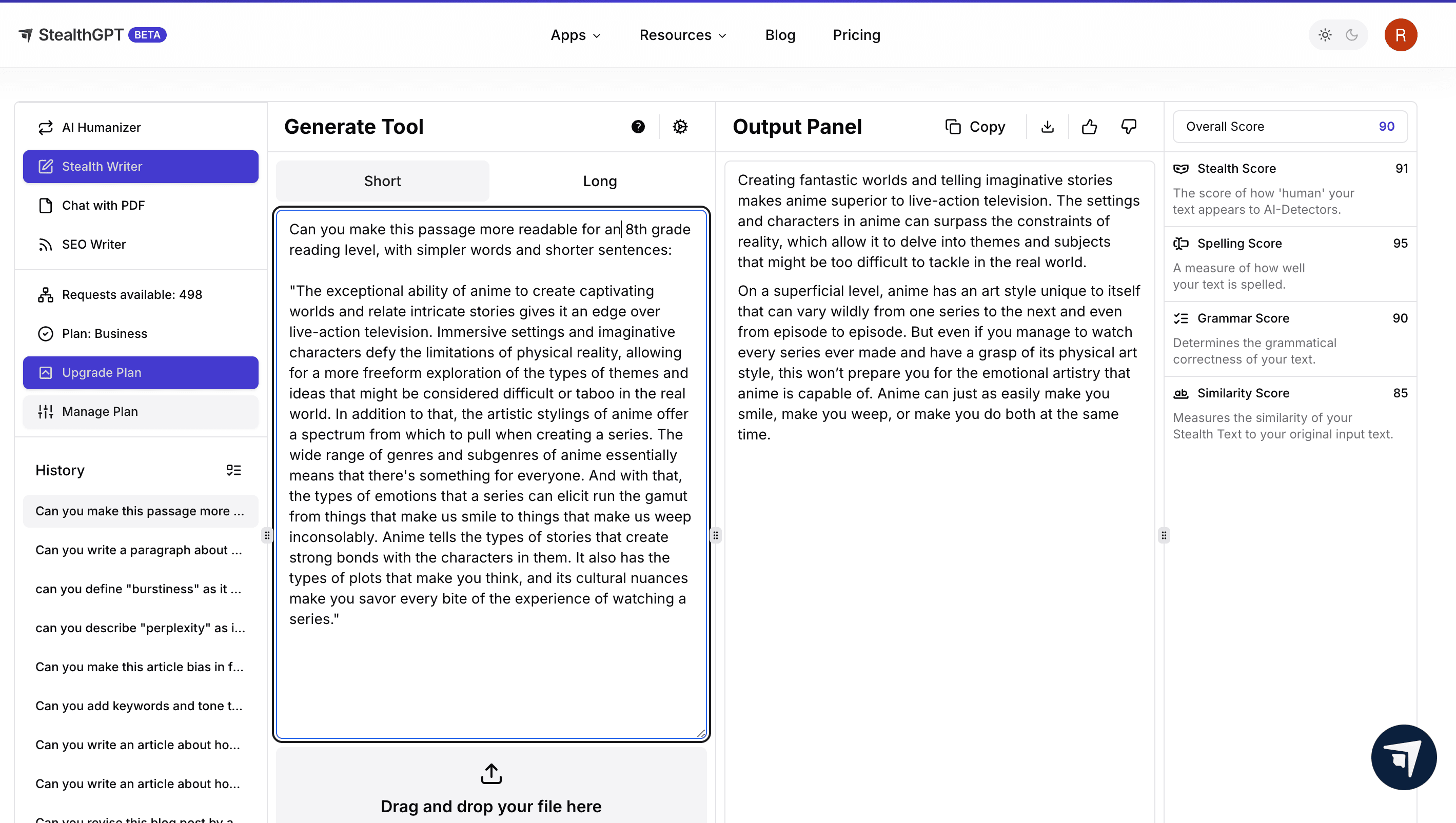 Maybe the words StealthGPT gave you in this output were a little too complicated for your target audience though. Maybe they want simpler word choice and shorter sentences. Okay, this is how we make StealthGPT outputs more readable using prompts: