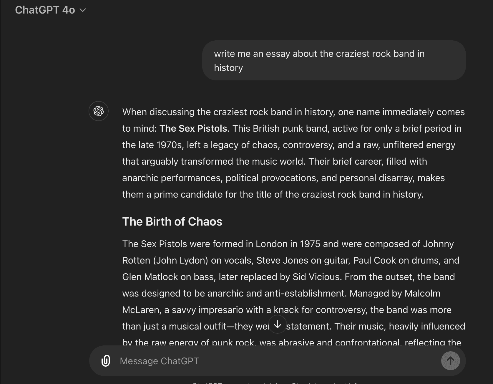 We’ve created an essay with ChatGPT about The Sex Pistols featured below: