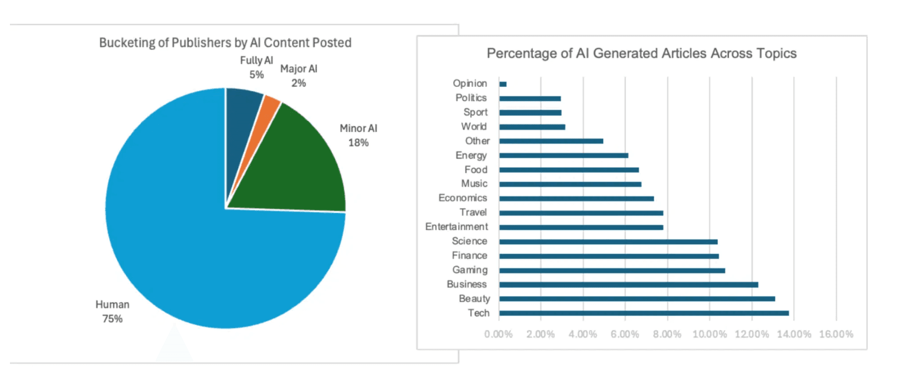 The graphs above show the distribution of content between human and AI writers as well as which topics are more commonly generated by AI.