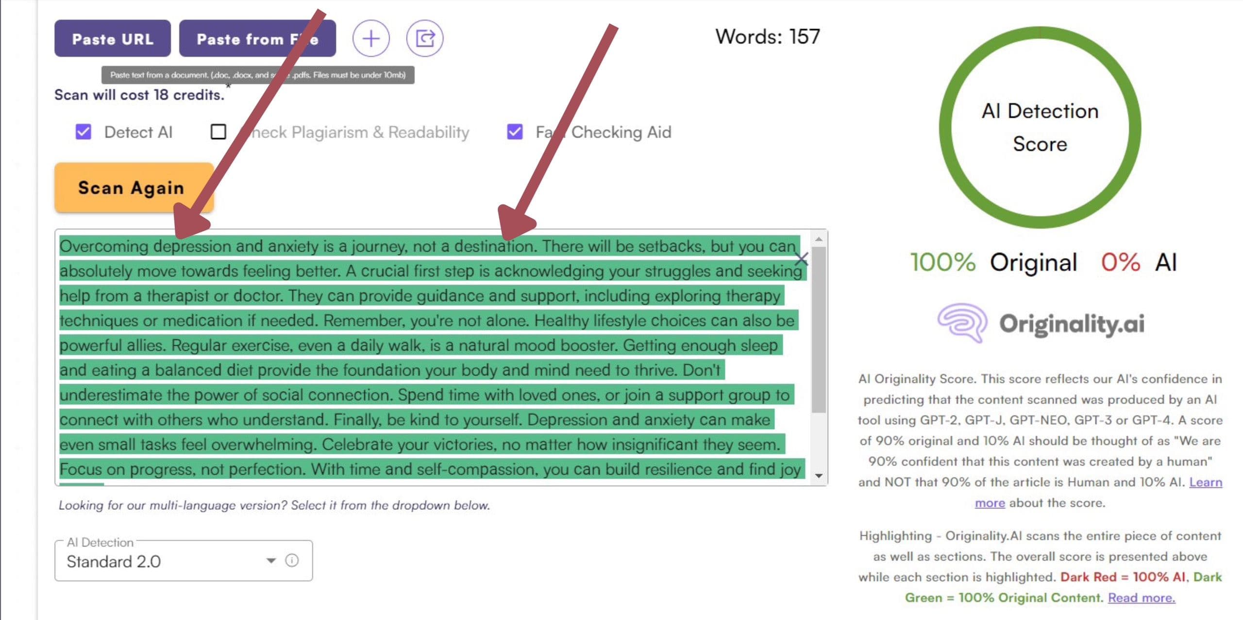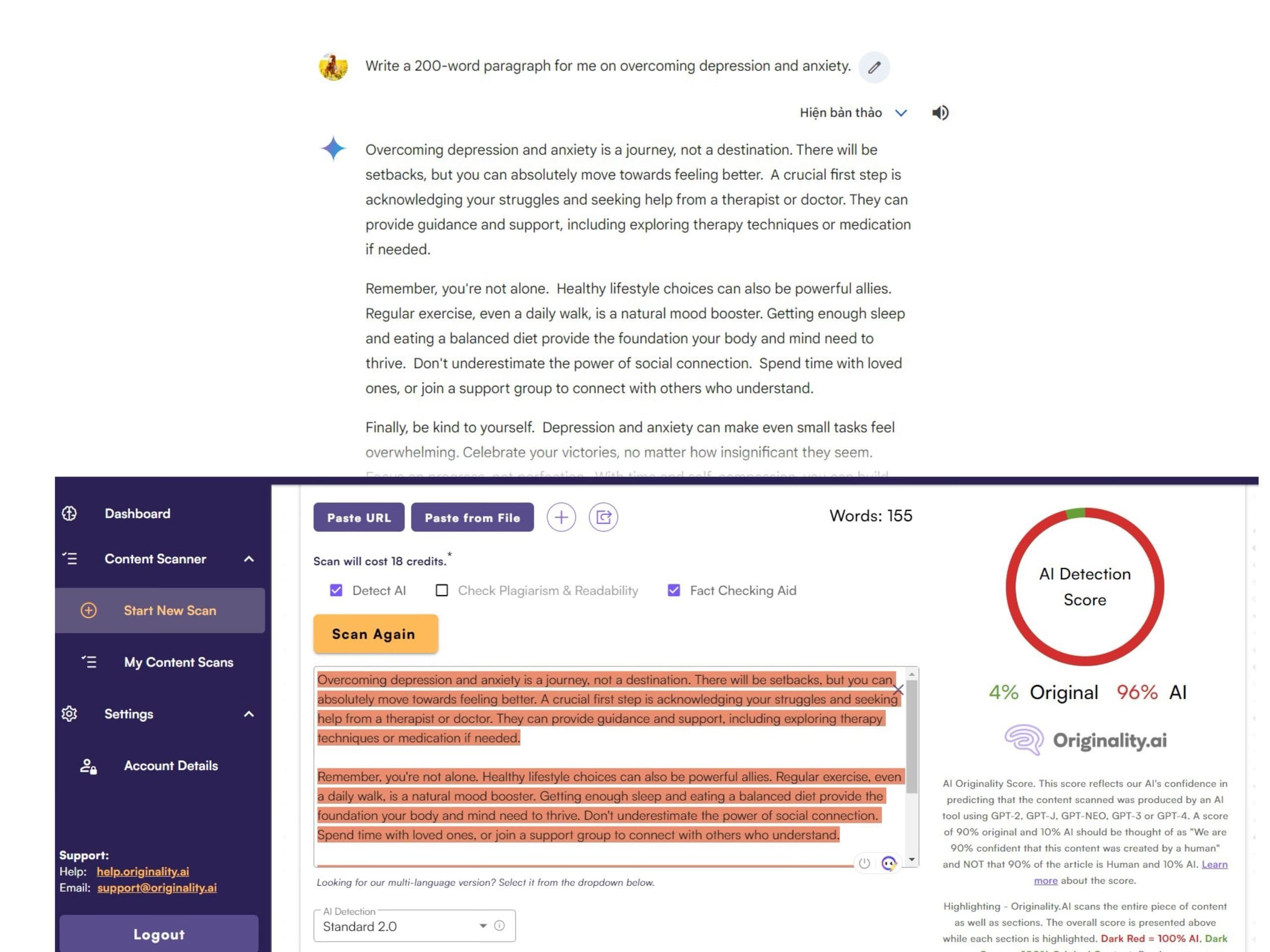 To show you how effective this method is, I will go back to Google Gemini and create a new prompt about “How to overcome depression and anxiety”. Then, I will put the newly produced text into Originality AI to check first.