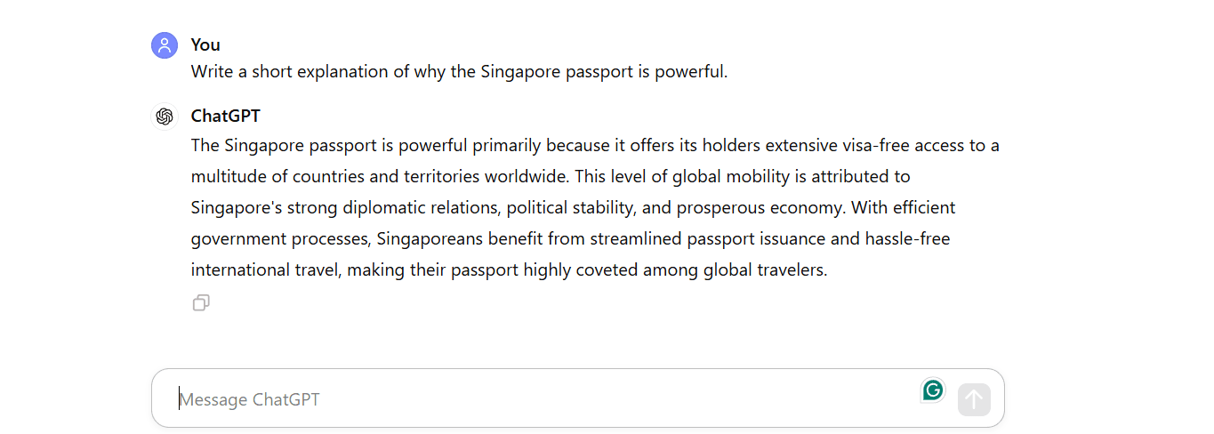 Here’s an example. I asked ChatGPT (a chatbot developed by the OpenAI company and launched in November 2022) to “write a short explanation why the Singapore passport is powerful", and here’s the screenshot of what it gave me: