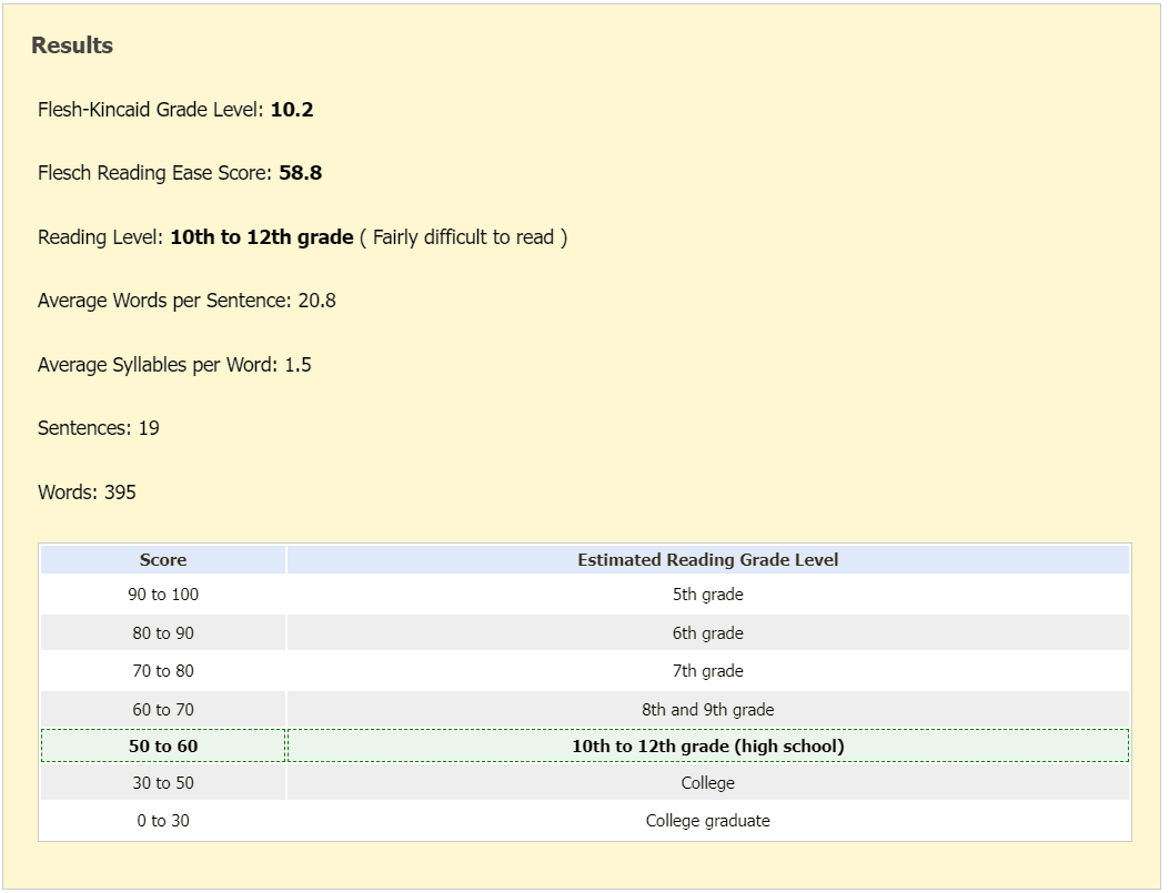 In this case, we will use the "Flesch-Kincaid calculator" to test because this is the most common measurement for readability in English. For reading ease, the higher the score, the easier it is to read. And grade level will show which level of education a person will need in order to understand.