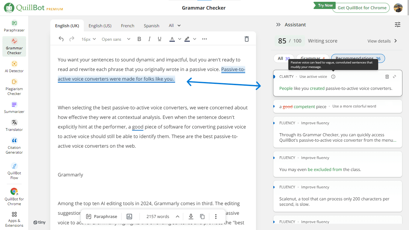 You could also use a specialized passive-to-active voice converter like Sapling, LogicBalls, or Writer. However, these tools limit the quantity of text that you can process per time. Sapling, for instance, can process only 40 to 50 words in one run.