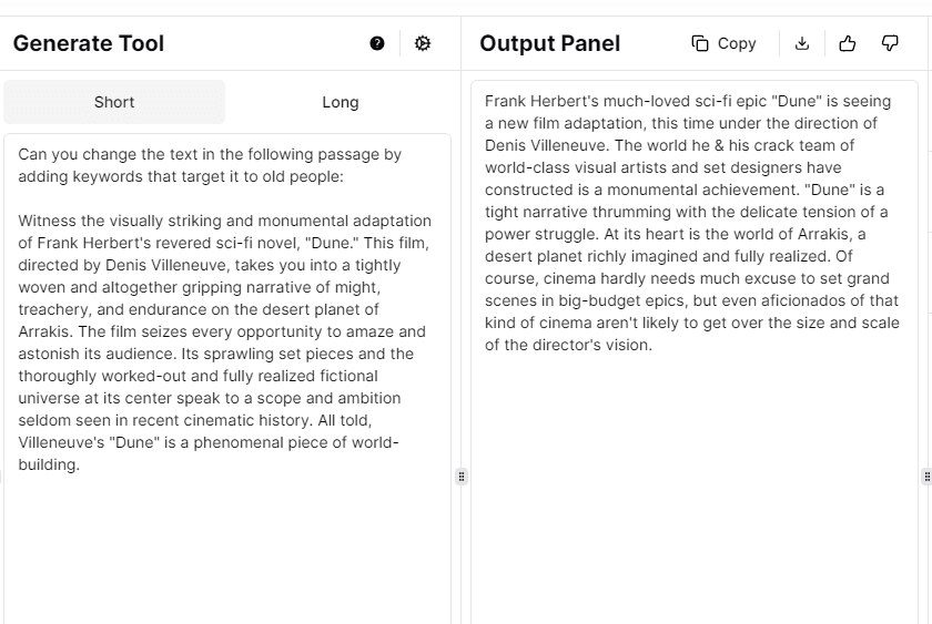 Here you can see us entering a prompt to add keywords to our movie description to personalize it toward a new audience. Instead of college students, let's try selling Dune to old people by using words they identify with.