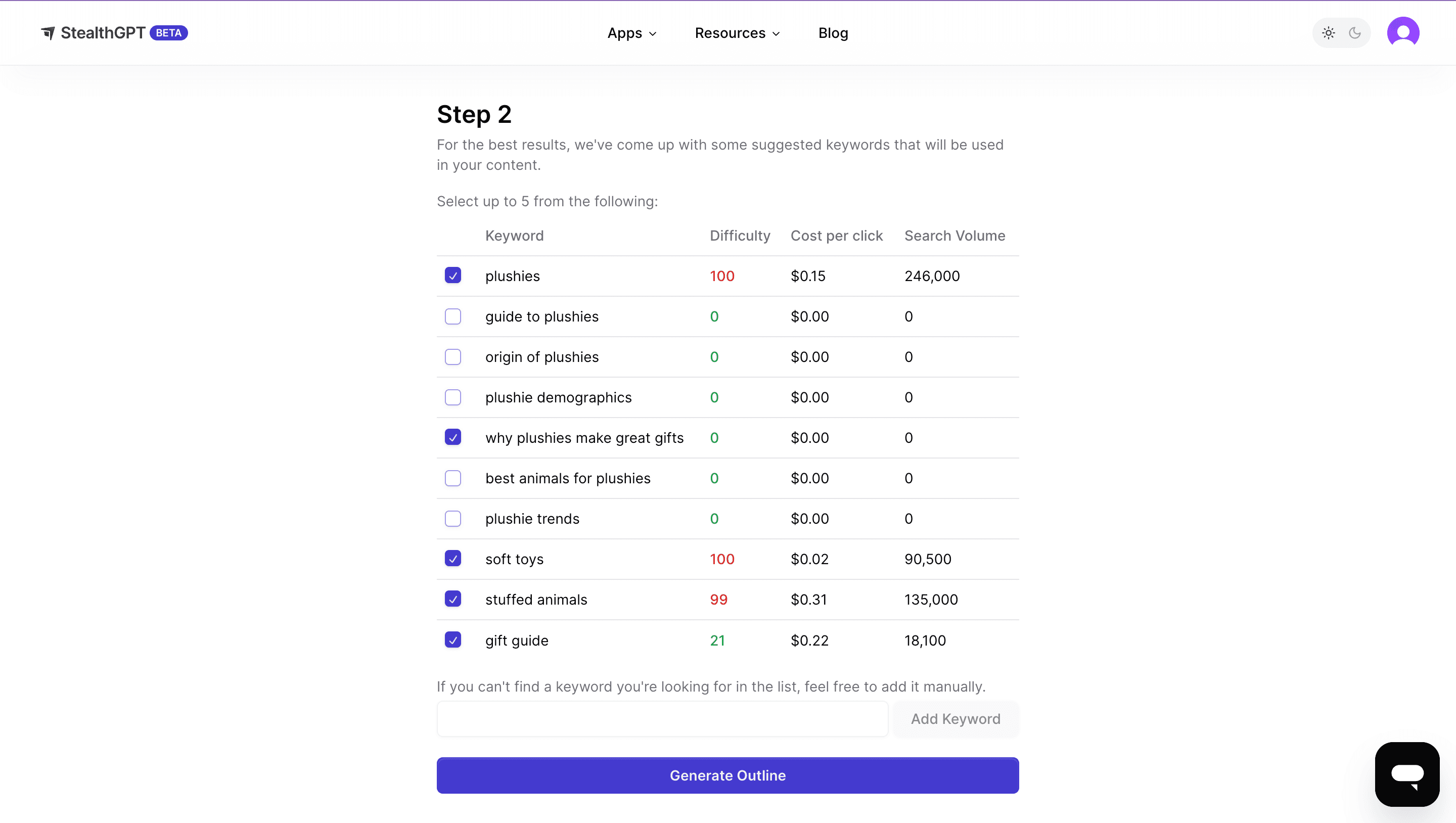 Here's what it looks like to choose your SEO keywords for our SEO writer. The higher the keyword difficulty, the harder it is to rank. It also has a search volume for you to see how much that keyword is being searched for.