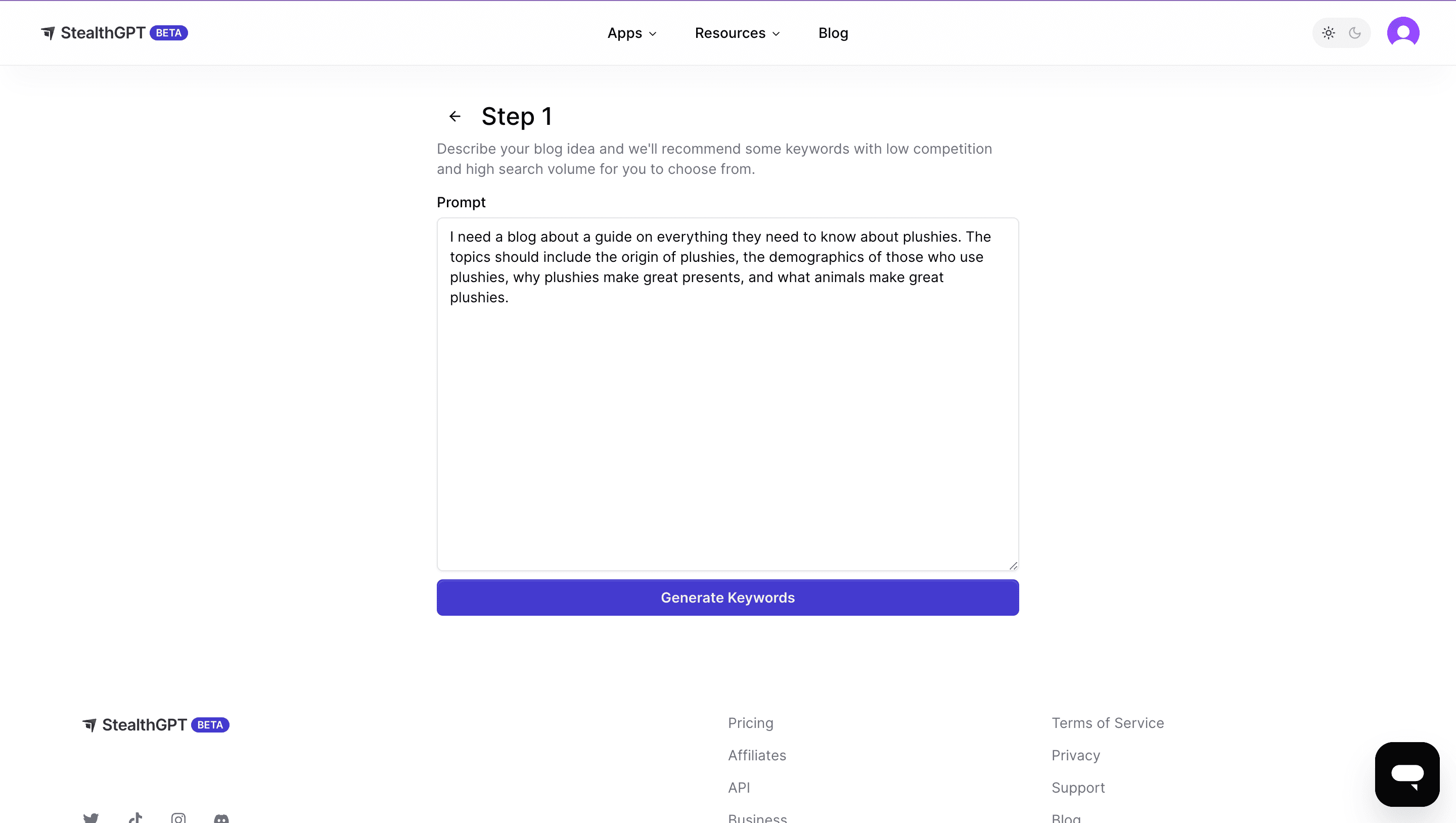 Our pillar page will be about a guide about plushies. Here's what the blog idea looks like. The more you explain the blog idea, the better the blog outline will be. Once you are done, just hit generate keywords.