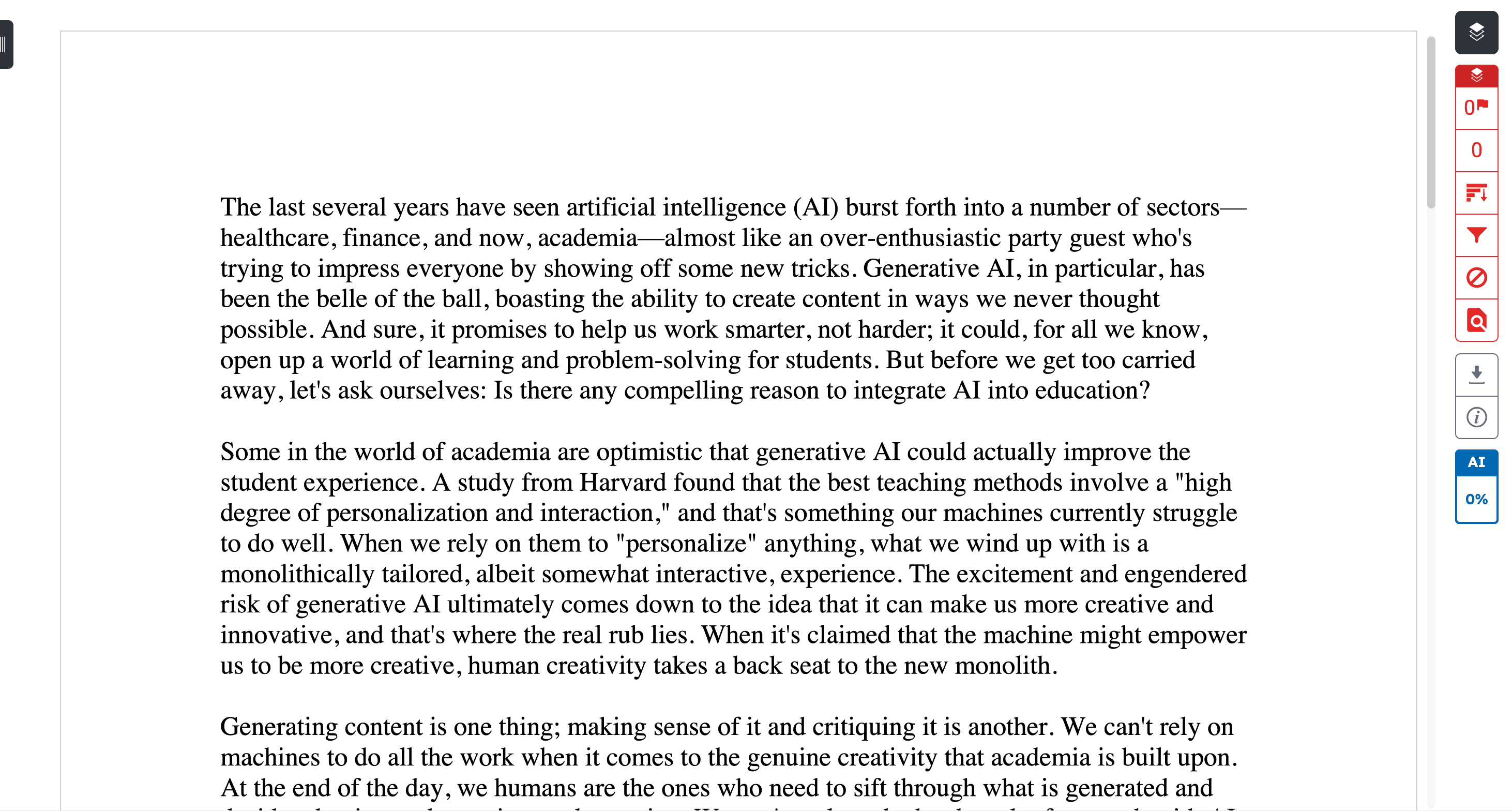 Finally, it's time to put our essay to the test and see tif it bypasses AI detection tools. Here is the result of running the essay through Turnitin, the premiere AI detector:
