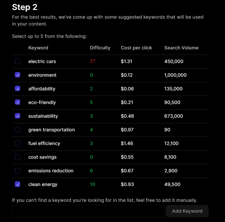 In this step you can select up to 5 of SEO Writer’s generated keywords, they’re selected by the system based on relevance to the topic in addition to keyword difficulty (KD), cost per click, and Search Volume. This process typically requires research and access to an expensive SEO database, but we’ve greatly simplified it for your value and convenience.