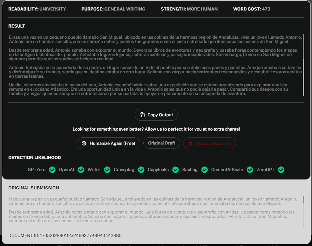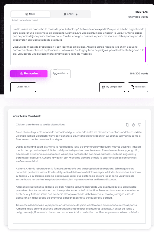 No necesita hacer nada especial, simplemente traiga su texto a StealthGPT y colóquelo en nuestro cuadro de entrada. Detectaremos automáticamente en qué idioma está el texto y la salida coincidirá con el texto.Aquí hay un ejemplo de texto en español.