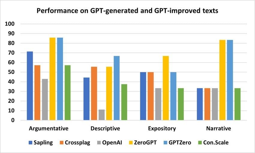 This image shows us how different AI detectors fare after passing AI generated essays of different kinds through them.