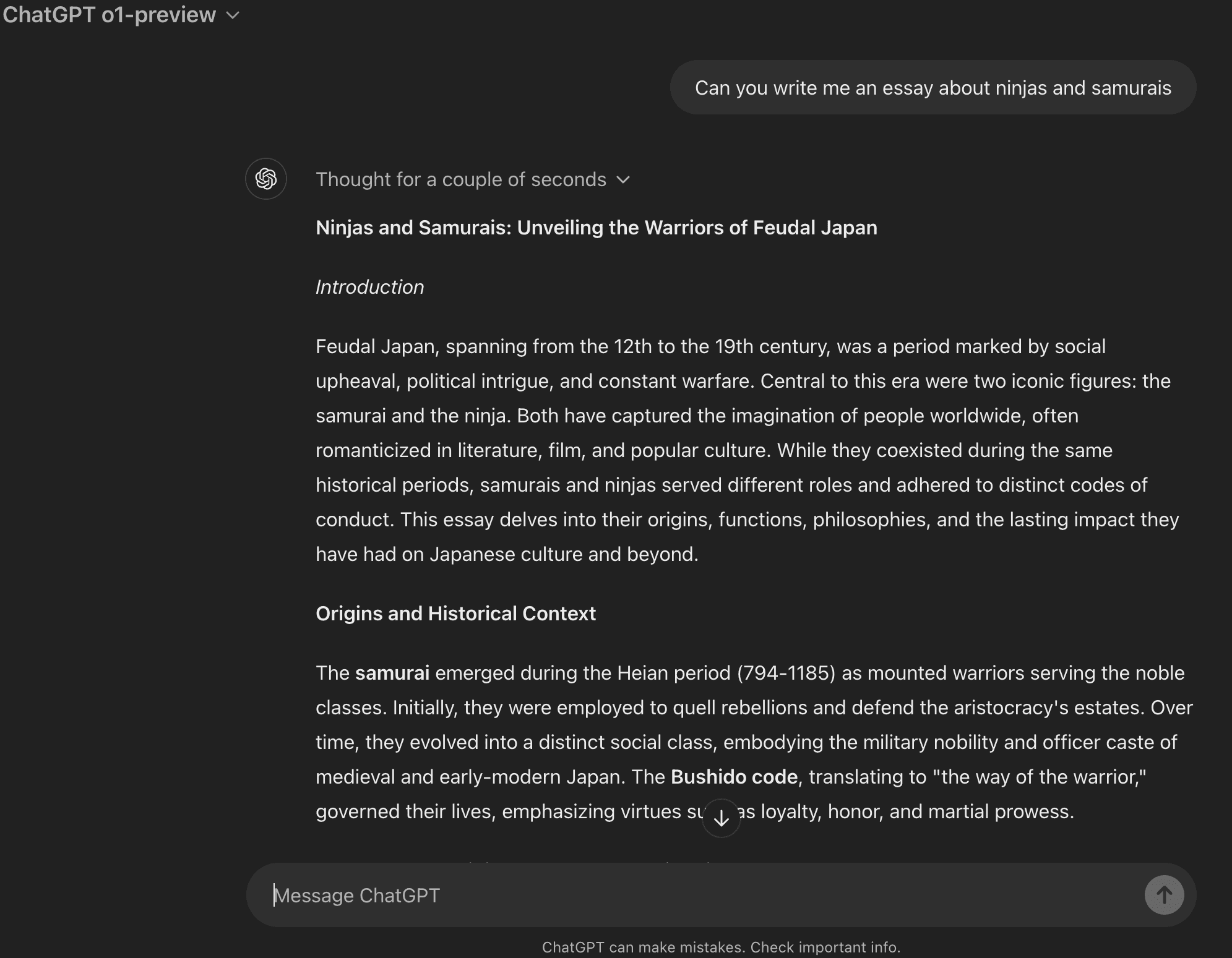 Now that you know the players, lets begin our game. OpenAI just released two new models of ChatGPT, so I’m going to run the new o1-preview against Originality.AI to see who prevails. Here is our essay from ChatGPT about ninjas and samurais: