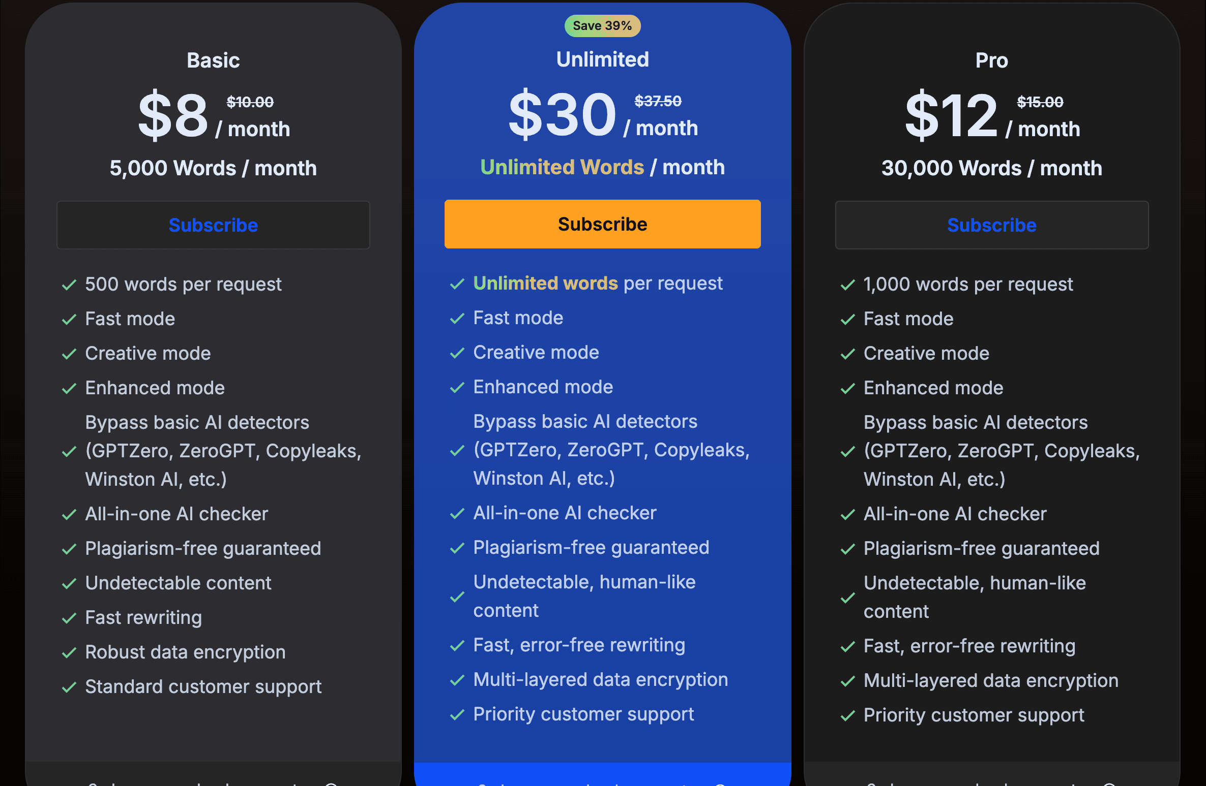 Decently priced packages for people that use AI casually can't promise you won't get caught with AI plagiarism accusations.
