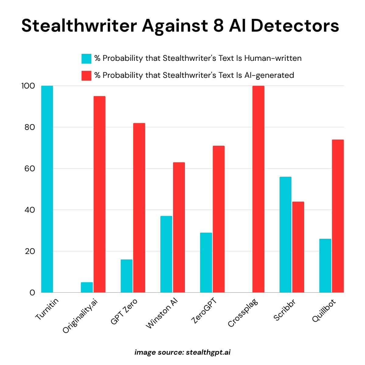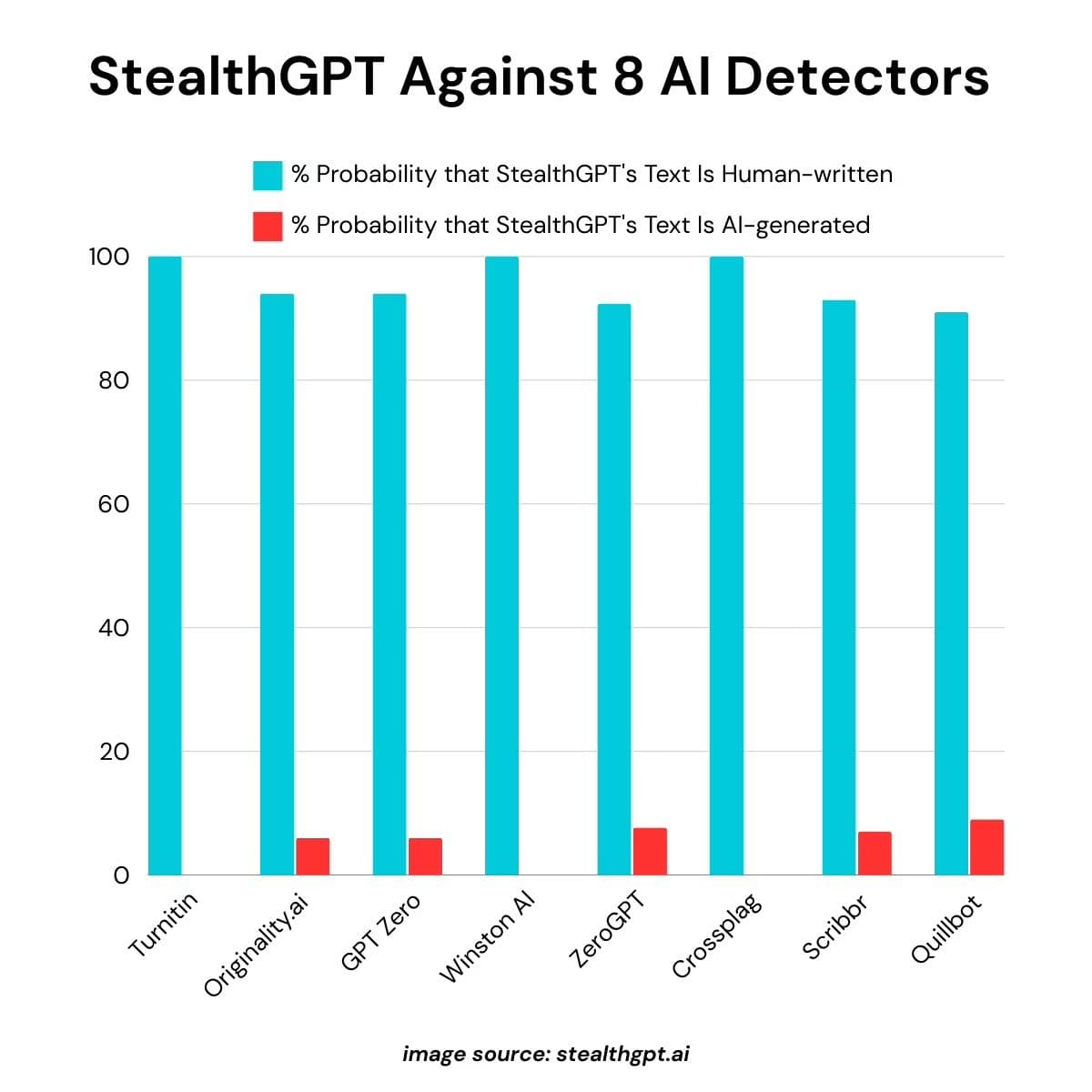Below is a graph detailing our results from using StealthGPT outputs against a wide variety of AI detectors such as Turnitin, Originality.ai, GPTZero, Winston AI, ZeroGPT, Crossplag, Scribbr, and Quillbot: