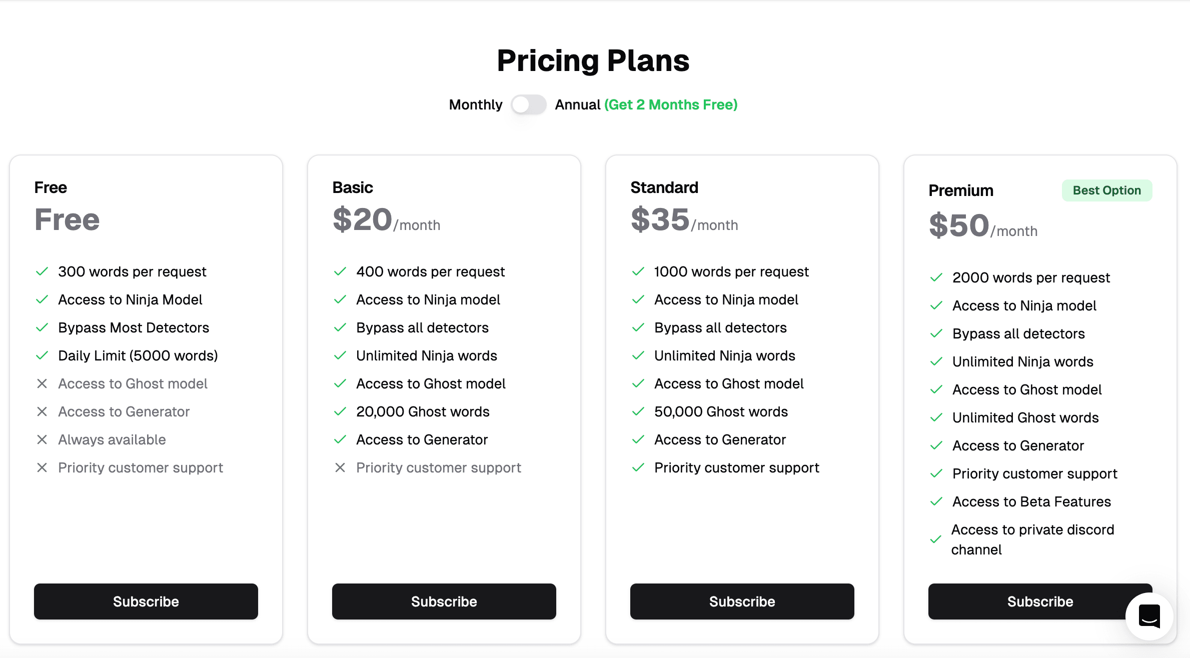 Stealthwriter's variety of price plans aim to "ninja" users out of a full undetectable experience. Their free version isn’t very useful with its word limit and low functionality while their higher priced plans don’t offer the power, nor perks, to make each price-point worth it.