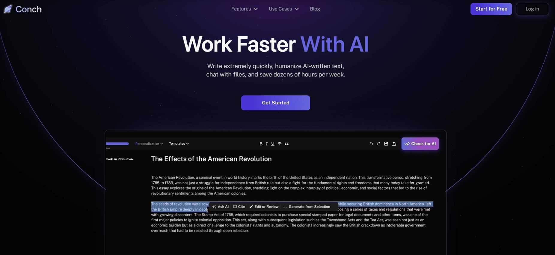 Conch AI is designed to bolster users' writing abilities and streamline their content creation efforts. It boasts the capability to generate texts that evade detection by AI monitoring tools. Additionally, it aims to weave AI into the educational sector, assisting students in their writing, studying, and research endeavors.